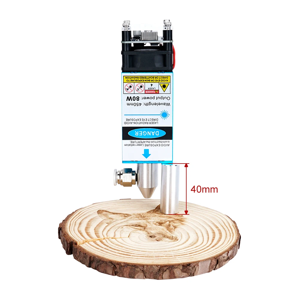 The laser head comes with a specially designed air assist nozzle. When cutting with this laser head, the air assit system will blow air through the air nozzle. That will bring you excellent cutting experience and greatly reduce burned marks. To make full use of the air assist, please prepare an assist pump and air tubing by yourself.