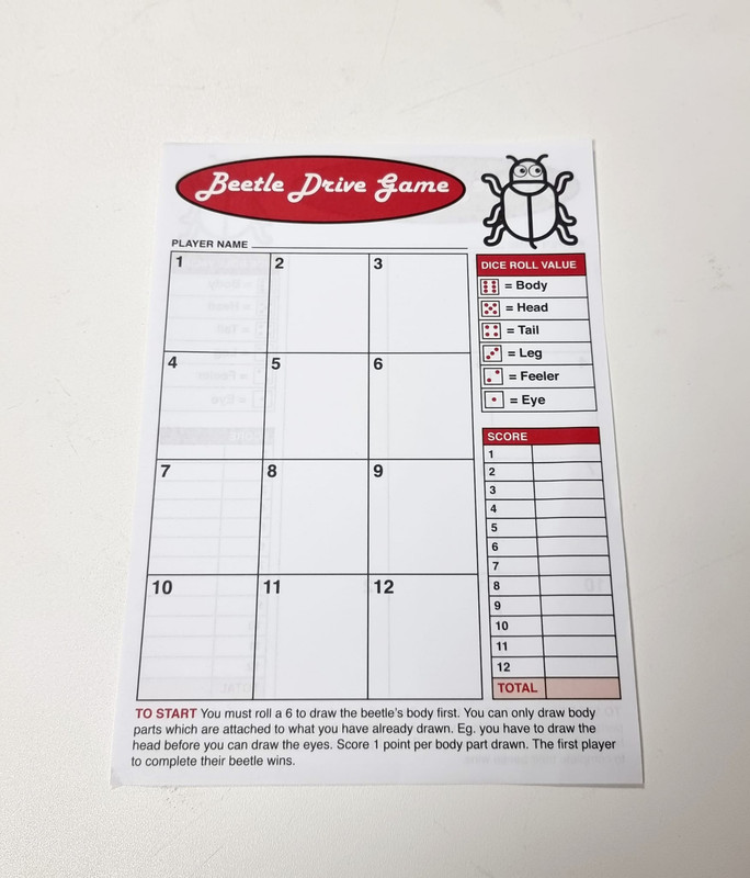 Each card has 12 squares (games/rounds) to draw your beetle in.
