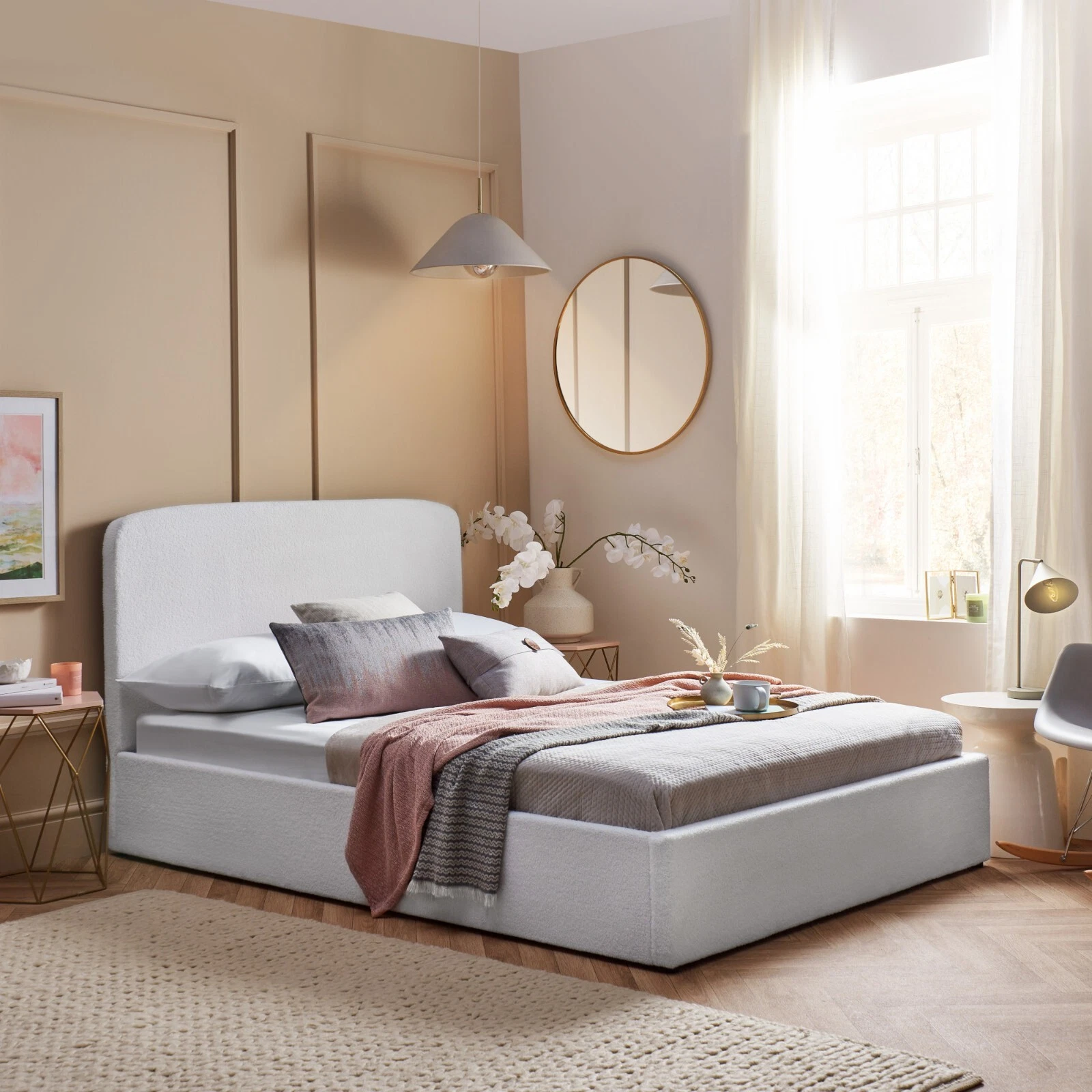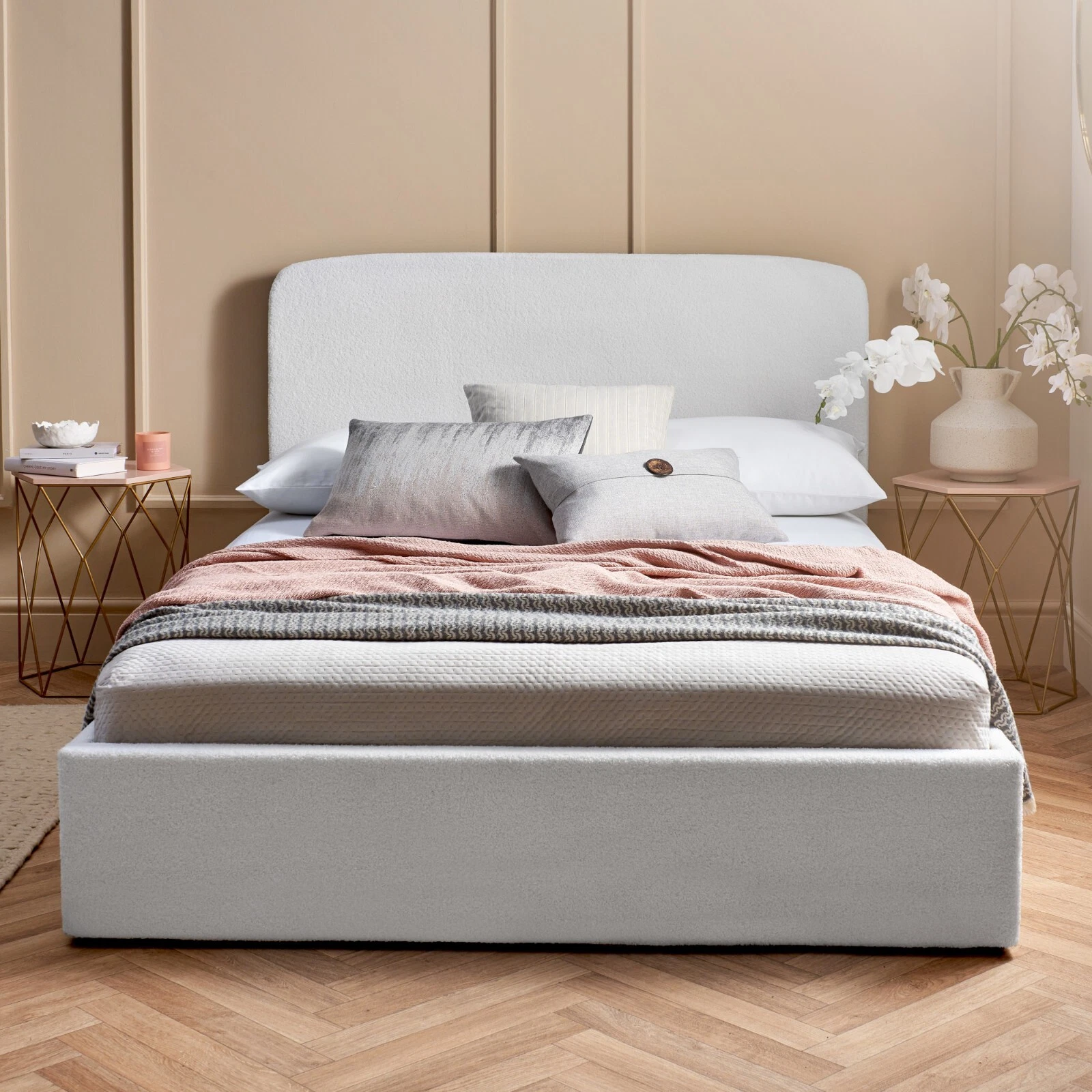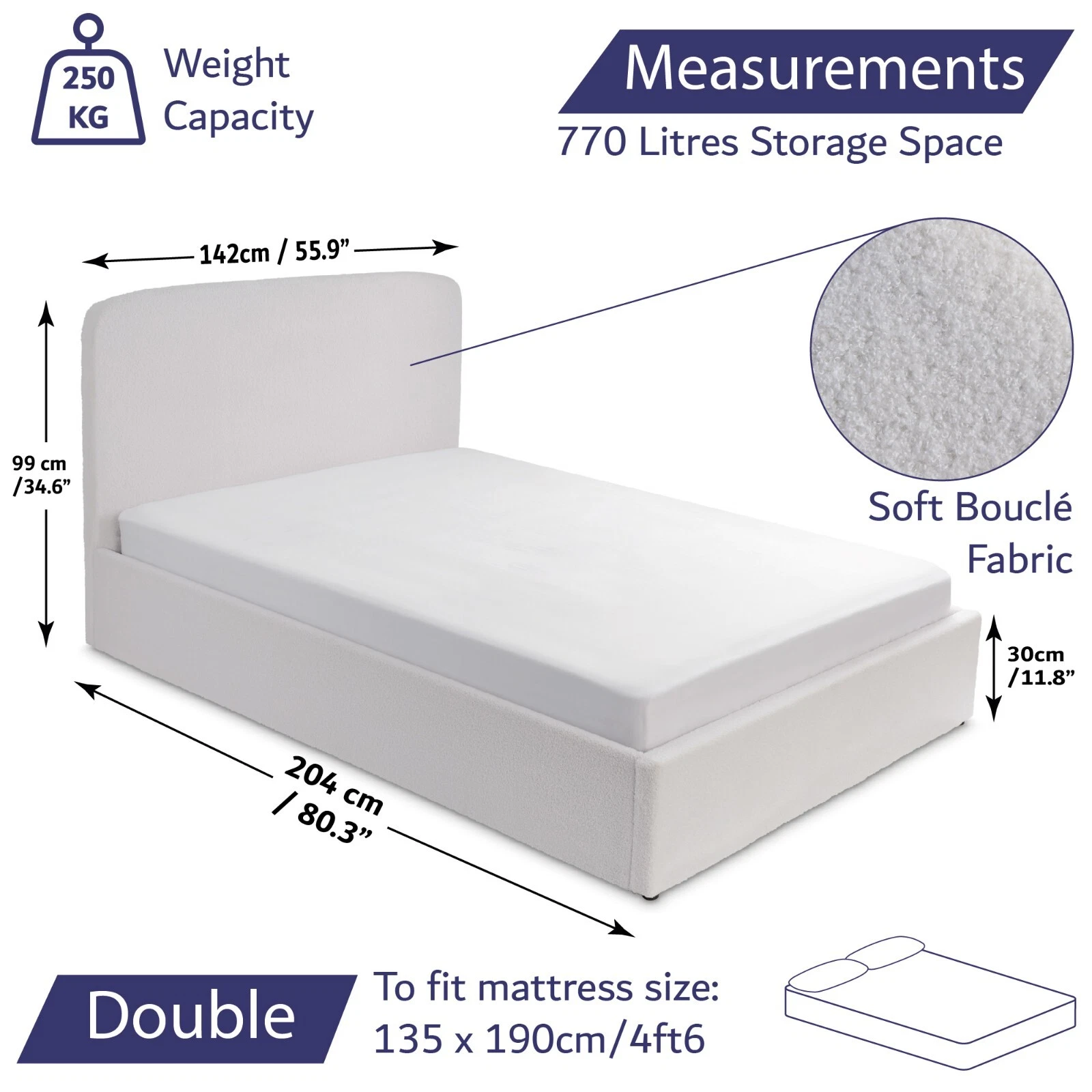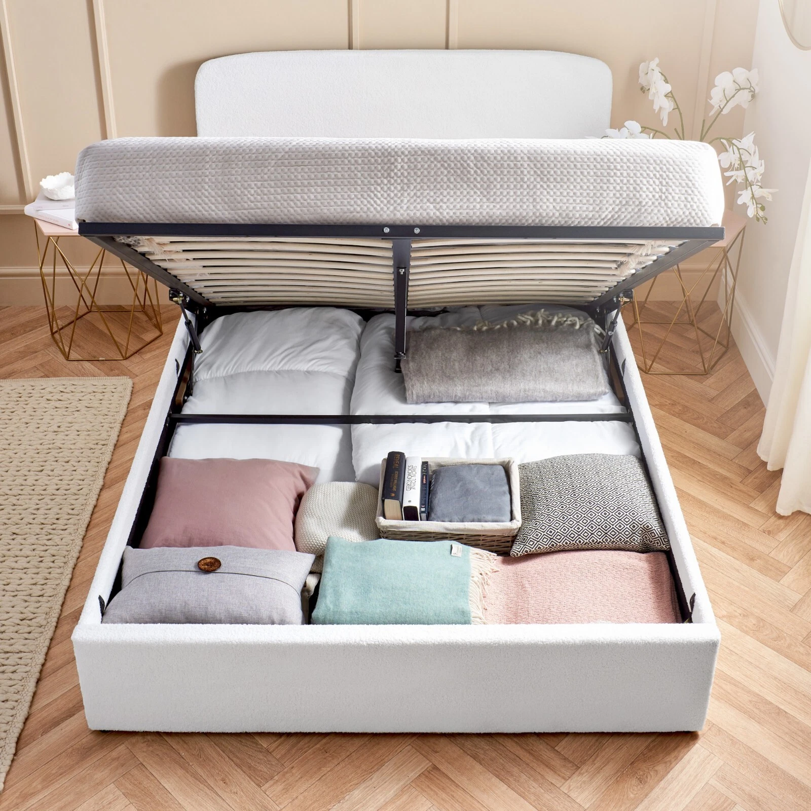 Stylish - Stylish Bed- Add a touch of elegance to your bedroom with a bouclé storage bed frame. Plush thick ‘looped’ & ‘curled’ natural white fabric creates a sophisticated look.