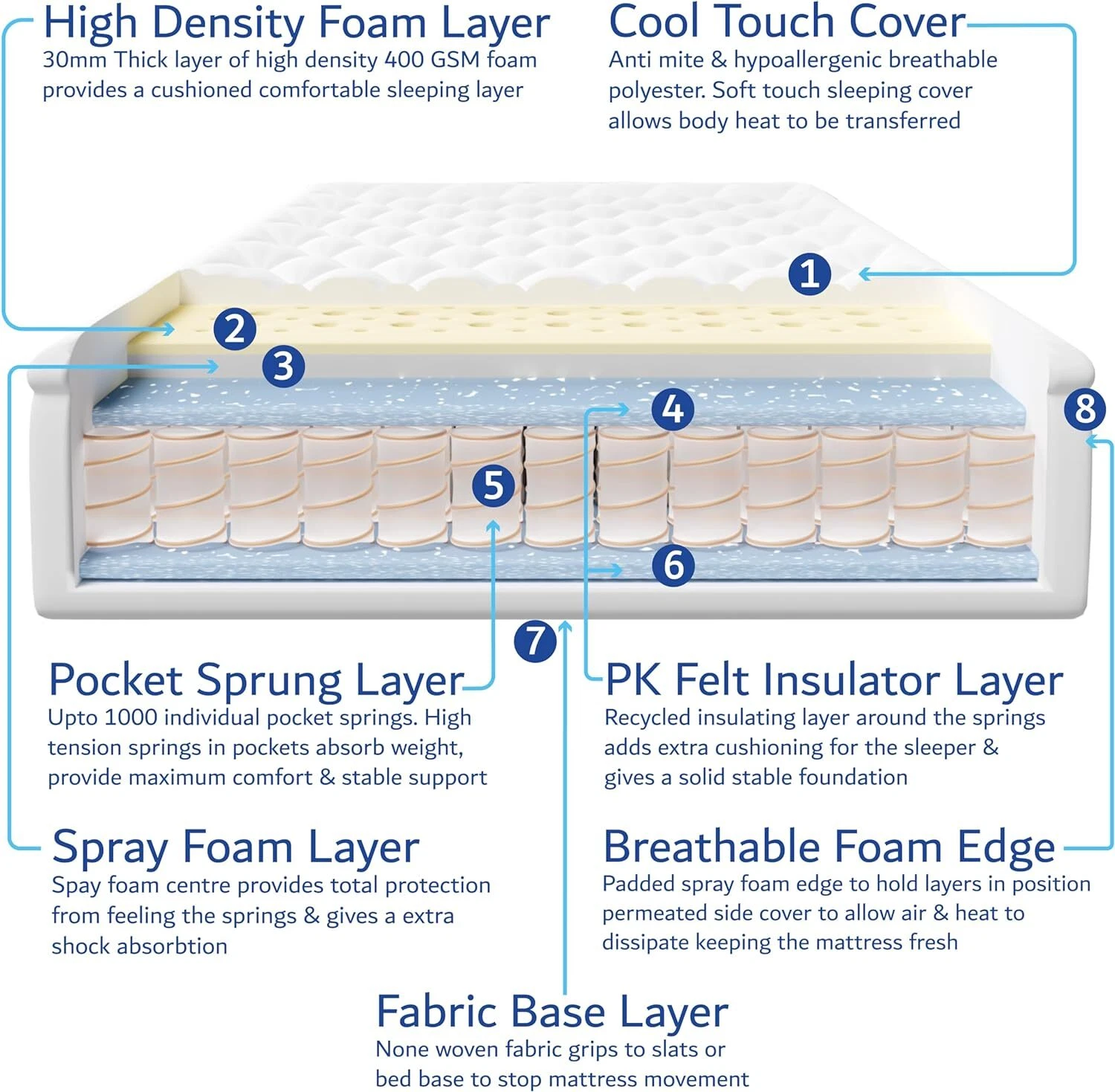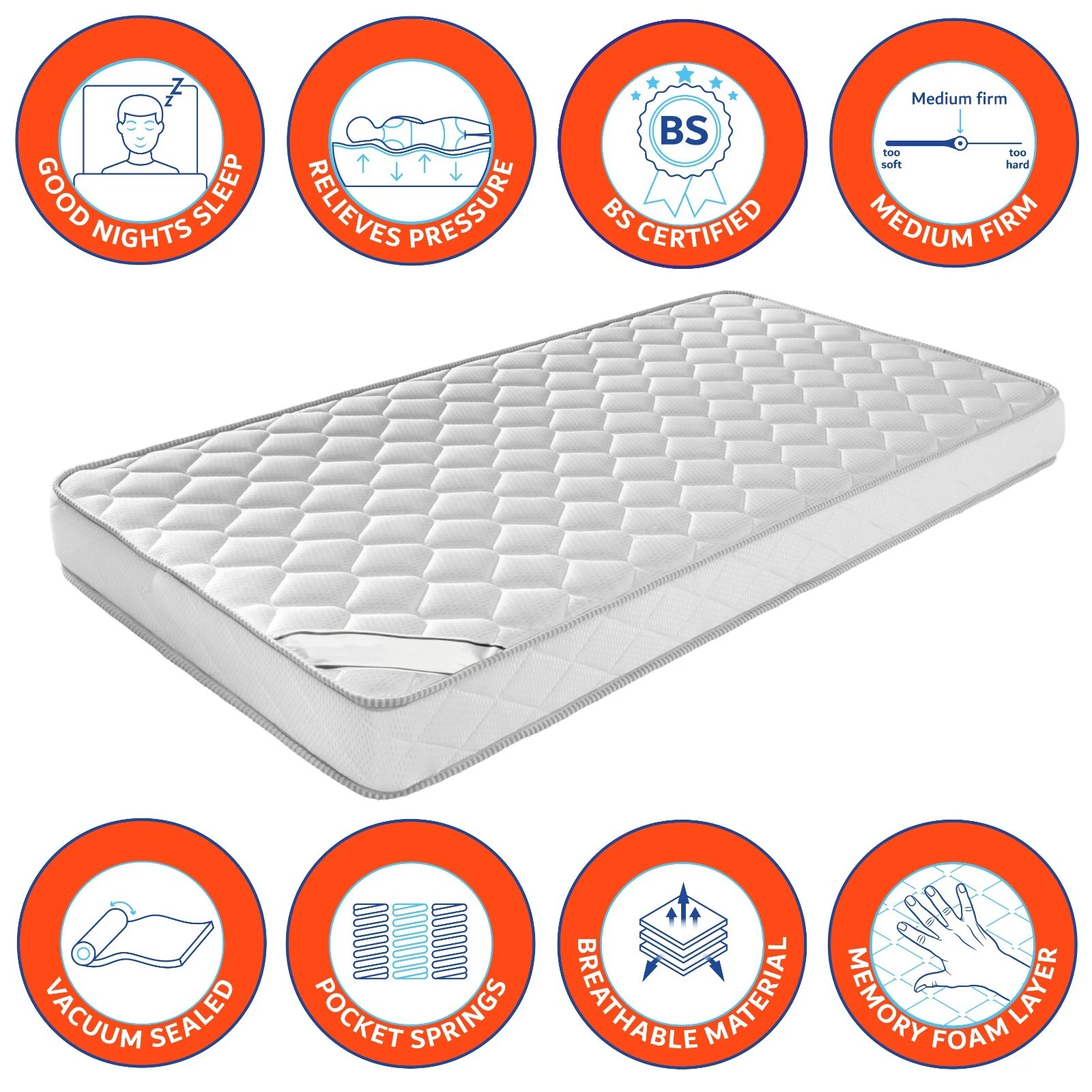 Pocket Sprung Mattress ✓ Deluxe comfort pocket sprung mattress- Thick 16cm with up to 660 independant springs mould to the body. Padded quilted top layer. Medium Firm- British Standard Certified