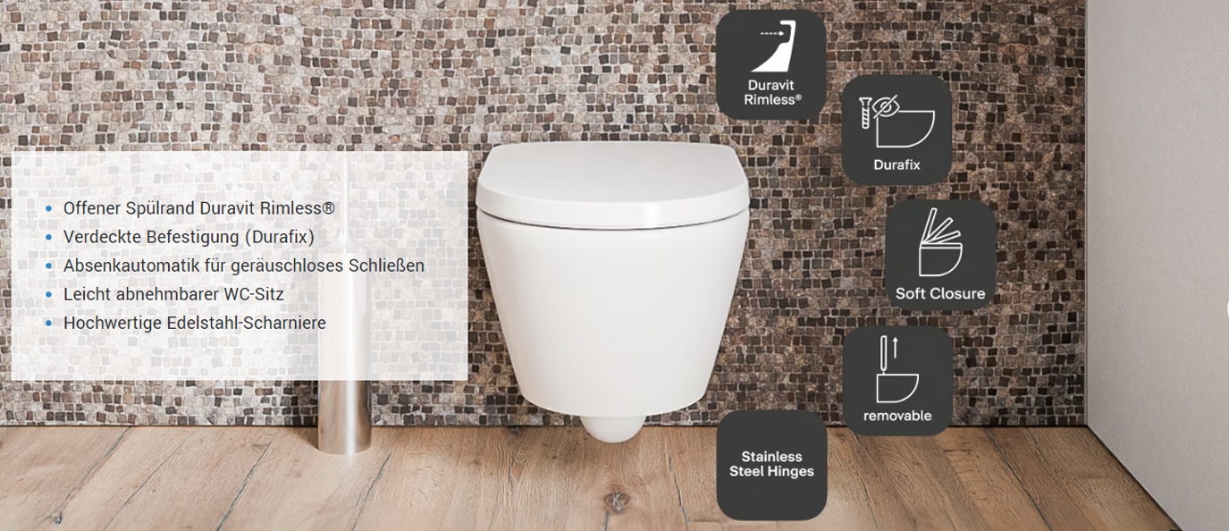 Das patentierte Befestigungssystem ermöglicht eine mühelose Installation und schafft ein harmonisches Erscheinungsbild, frei von störenden Elementen. Mit seinem Tiefspüler-Design minimiert das WC Geruchsbelästigungen, während die Absenkautomatik sanftes und geräuschloses Schließen garantiert.