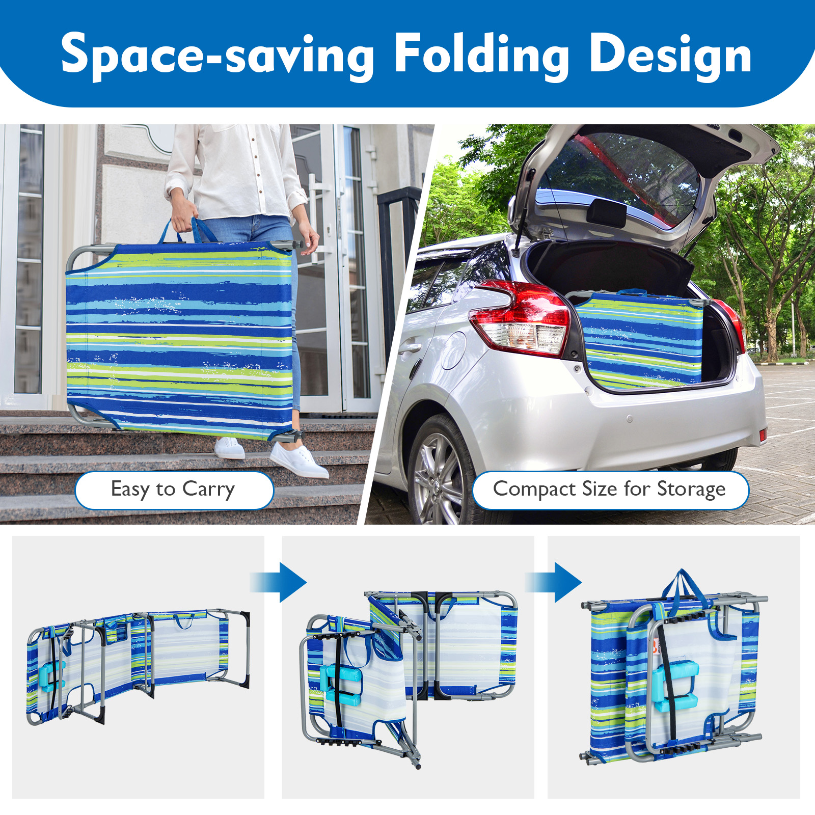 Constructed with high-quality oxford fabric, our lounge chair is durable and built to last. The premium steel frame is resistant to high temperatures and rust, making it suitable for both indoor and outdoor use. With a maximum load-bearing capacity of 330 lbs, this chair is sturdy and reliable. The breathable fabric and ergonomic pillow provide a soft and comfortable sitting experience. The chair features a face cavity with 2 arm slots, allowing you to use your cell phone or read a book comfortably. The installation-free design saves time and energy, while the 5 adjustable positions cater to different needs. Non-slip feet add stability, and the removable pillow enhances convenience.