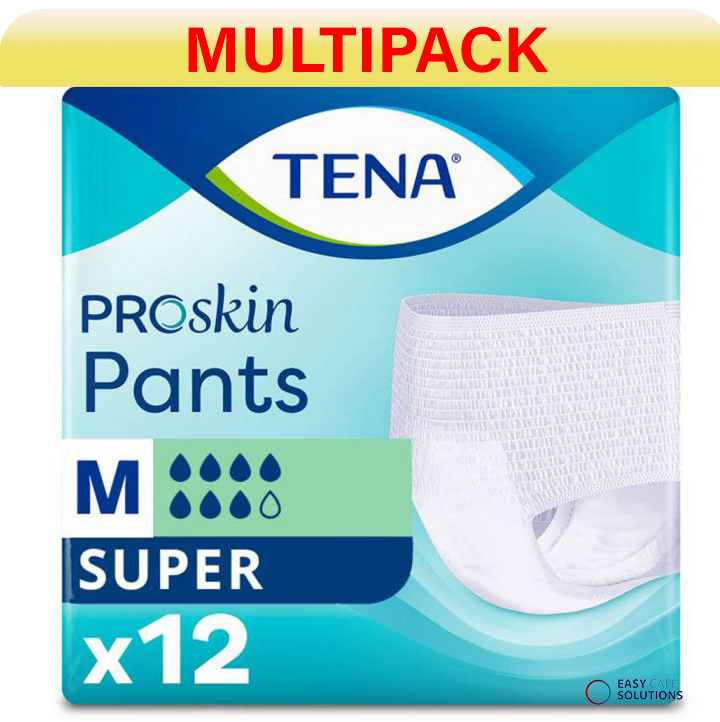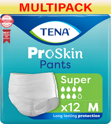 These Tena Proskin Super pants provide discreet protection for moderate bladder leaks. With their skin fit and cotton-like fabric, they feel just like regular underwear for all-day comfort. Each pack contains 12 absorbent pants with channelized cores that guide leaks towards the absorbent zones to help keep skin dry. The soft non-woven topsheet feels gentle against skin while the pants stay securely in place. Their super absorbency is perfect for active days or periods of heavy flow. Discreet, skin-friendly protection you'll forget you're wearing - that's the power of Tena Proskin Super
