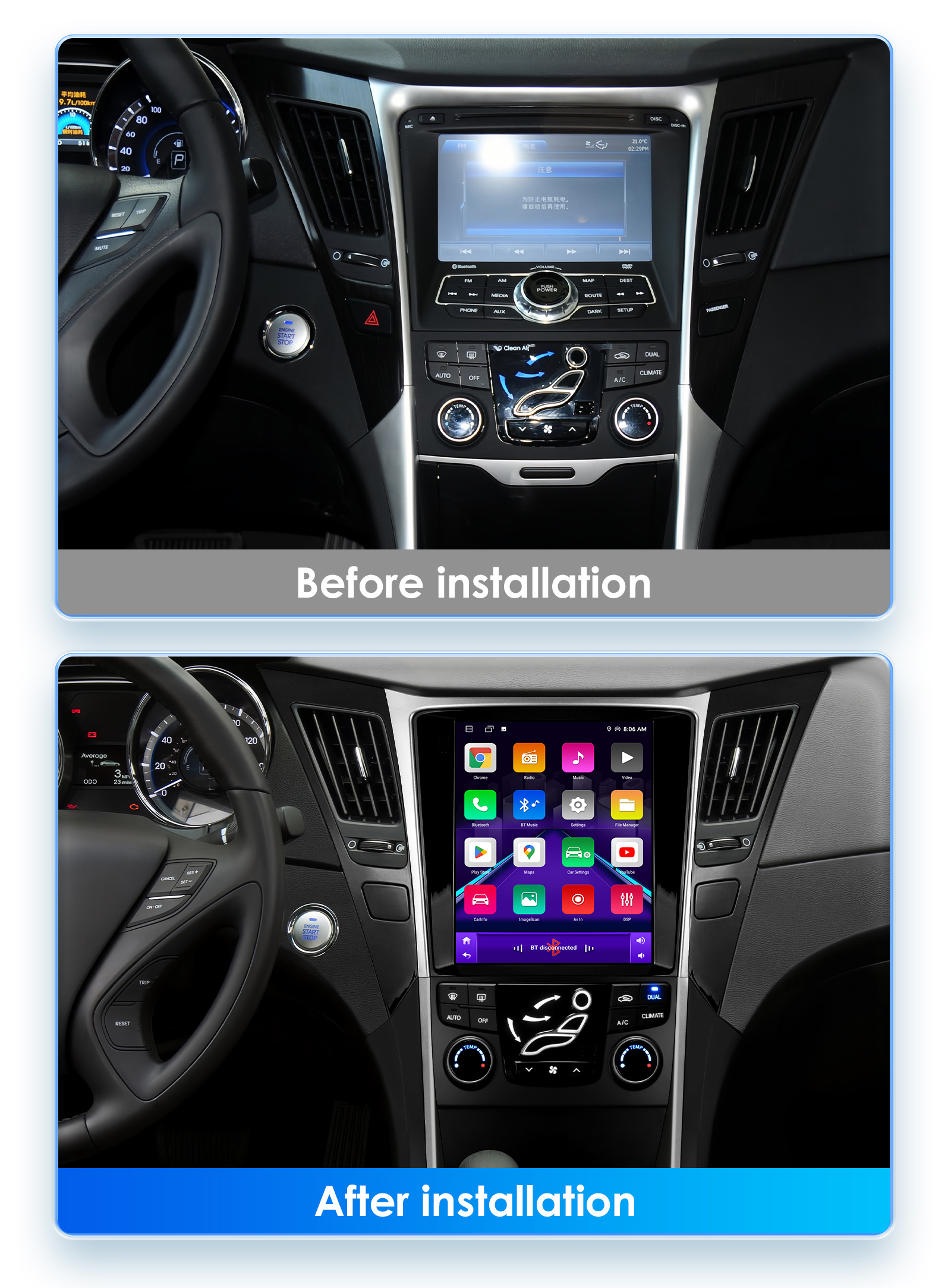 - Main Menu Status Bar display: Can be changed to Music/Radio/BT-Stereo Player and Clock/Date/Week