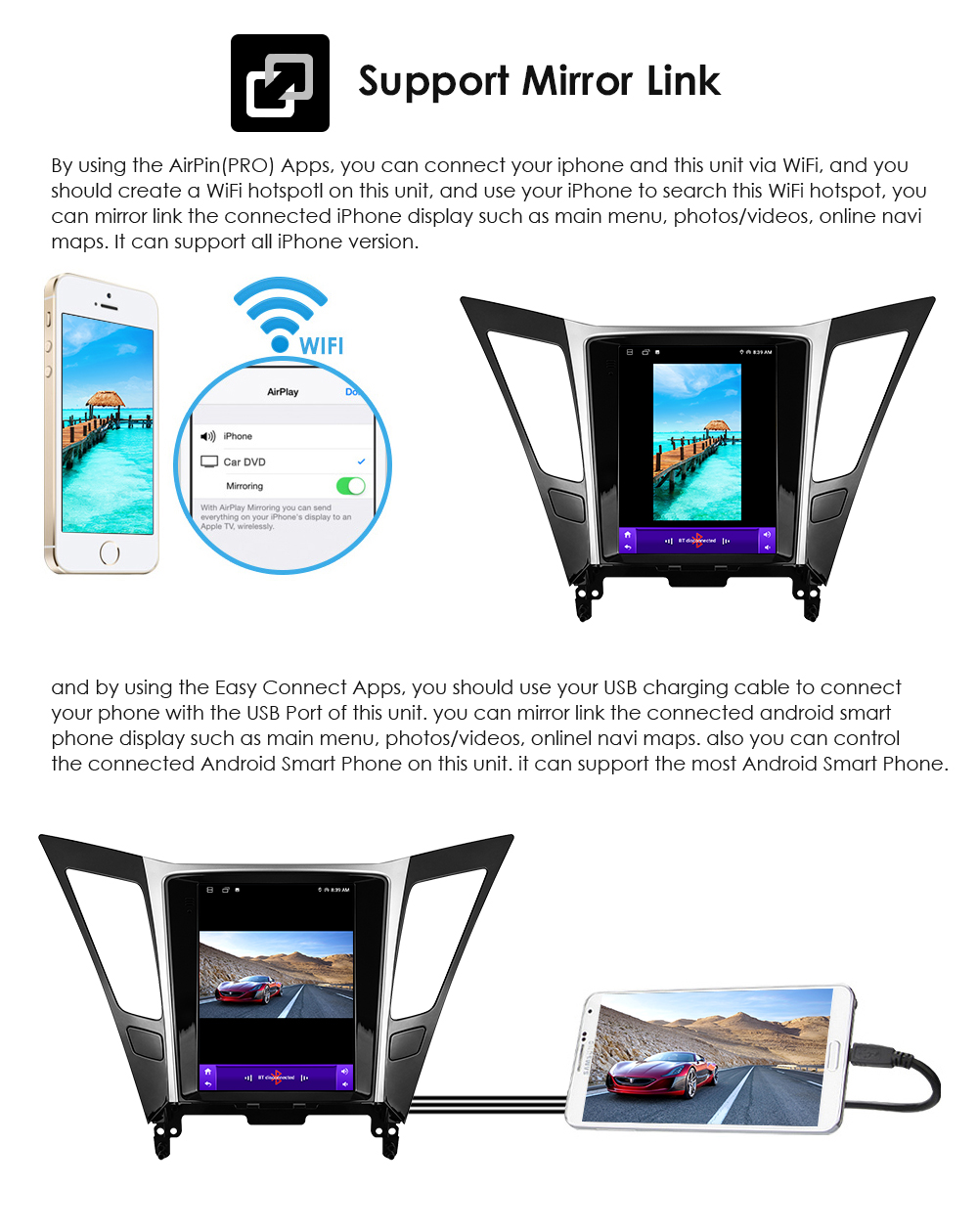 - Support Mirror Link function: Yes, support screen mirroring from iPhone and android smartphone