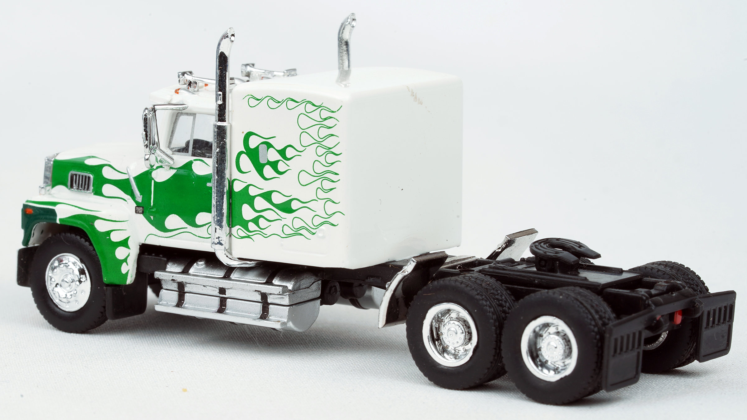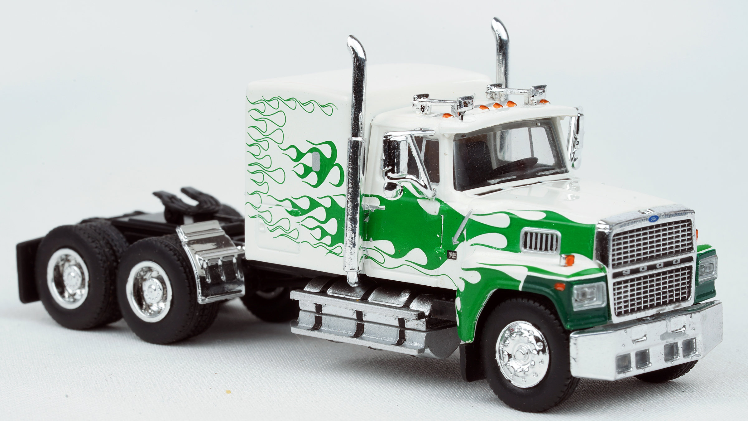 Brekina Ford LTL-9000 tandem axle truck tractor 116" BBC cab, 60" sleeper Prototype produced from 1978 to 1991 White/green flame paint scheme Chrome mirrors (buyer installed) Chrome grille, bumper, trim Chrome quarter fenders on the rear Dual chrome exhaust stacks Dual chrome horns Alcoa style 10 aluminum type wheels April 2024 release New in box SKU #85879