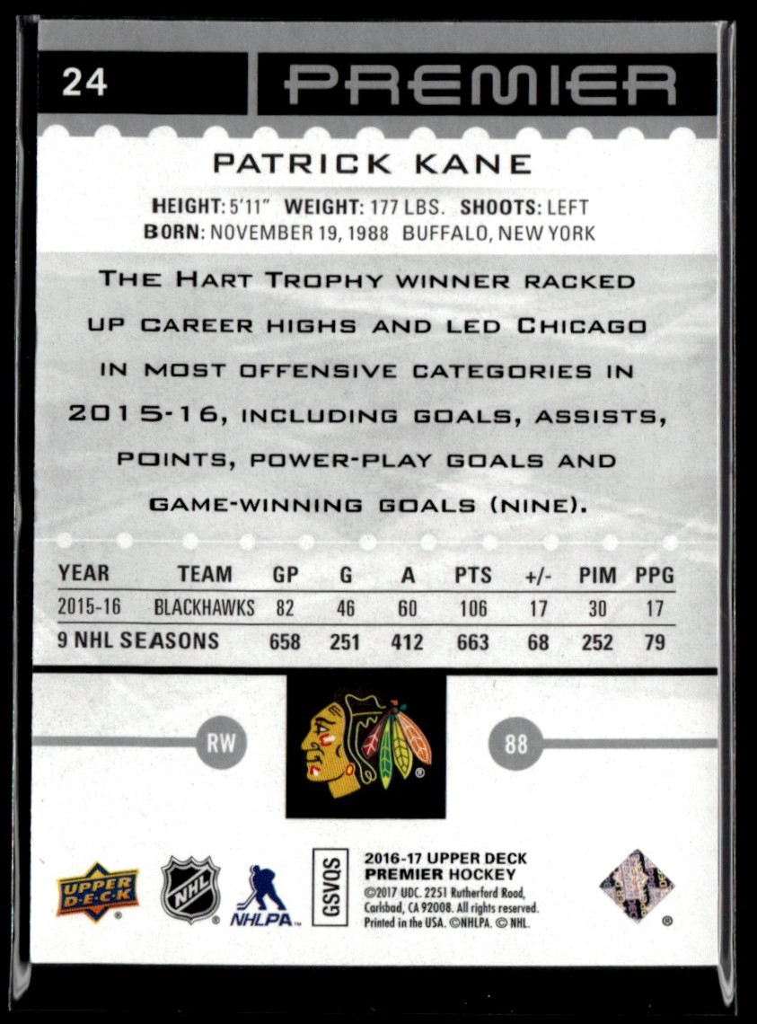 2016-17 Upper Deck Premier Patrick Kane 134/399 Chicago Blackhawks #88