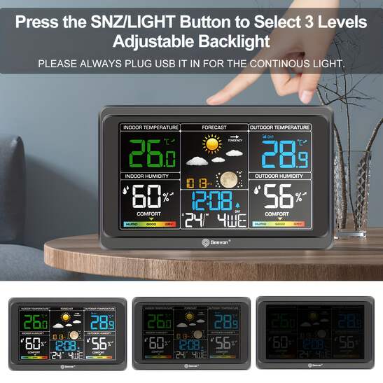 Geevon Weather Station Wireless Indoor Outdoor Thermometer, Color Display Weather Thermometer, Digital Temperature Gauge With Barometer, Calendar, USB Charge And Adjustable Backlight (Not Powered)