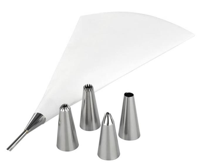 Set includes: 4 decorating nozzles, 1 filling nozzle & 1 icing bag