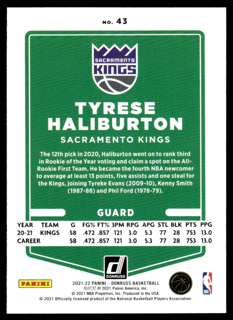 | 2021-22 Donruss Tyrese Haliburton Sacramento Kings #43 |