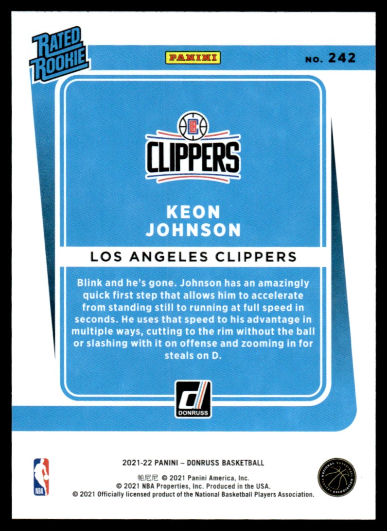 | 2021-22 Donruss Rated Rookie Keon Johnson Rookie Los Angeles Clippers #242 |