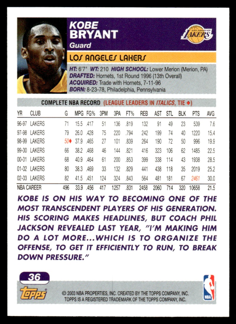 | 2003-04 Topps Kobe Bryant Los Angeles Lakers #36 |