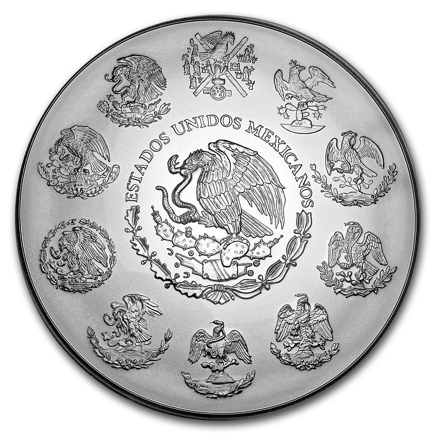- Obverse: Mexican national seal with an eagle sitting atop a cactus surrounded by symbols representing Mexicos 10 provinces.