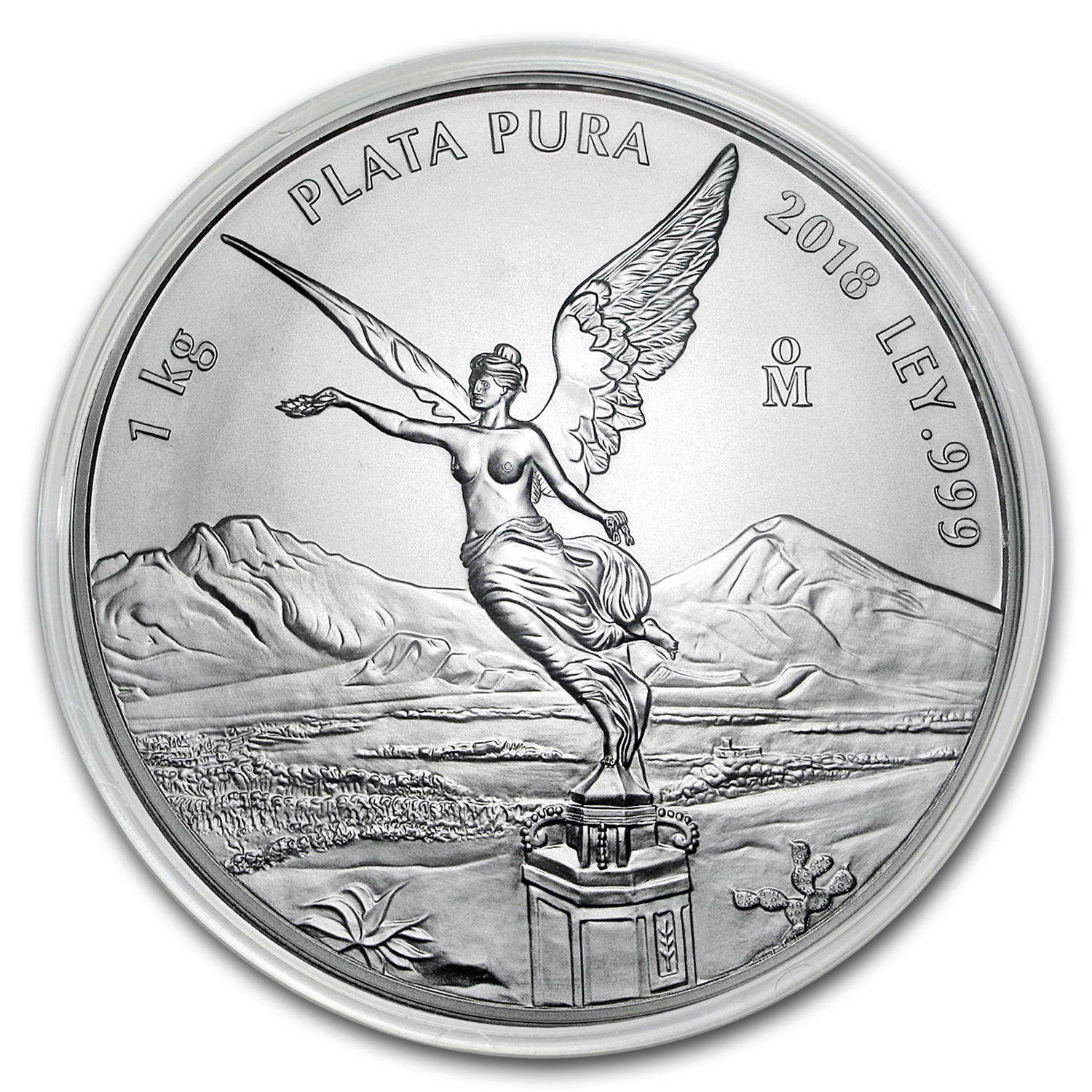- Reverse: Victory statue of Mexican independence in front of volcanic mountains Popocatépetl and Iztaccíhuatl, surrounded by the weight, purity and date.
