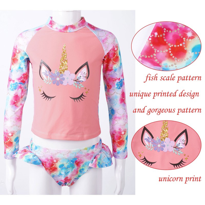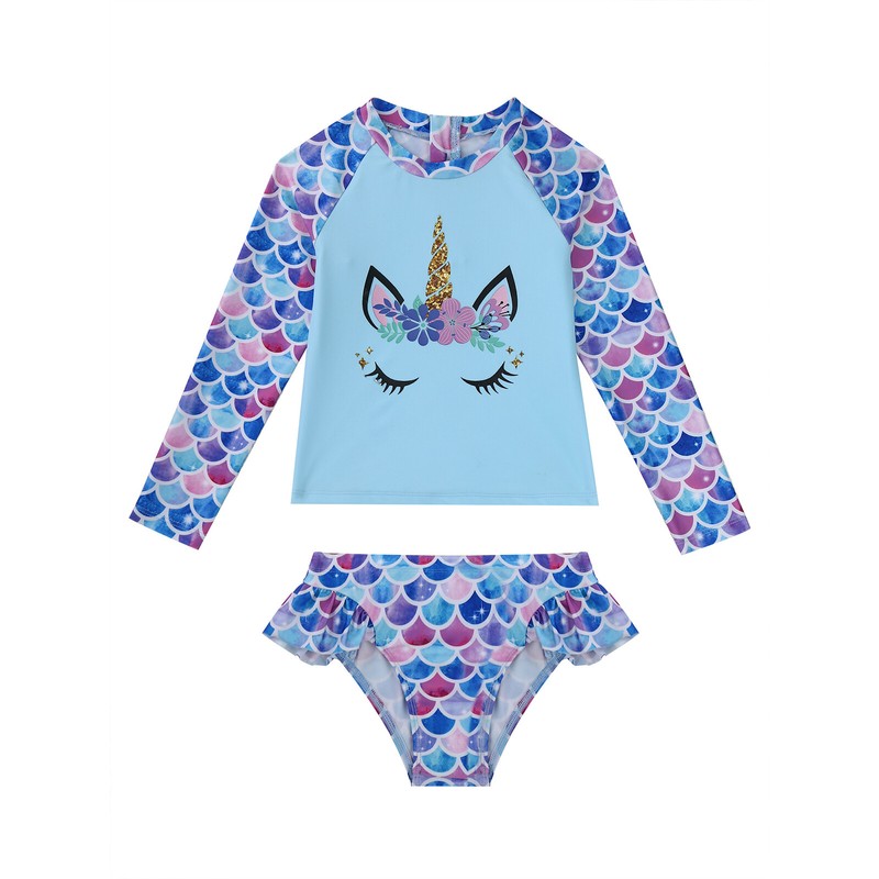 2Pcs Kids Girls Fish Scales Print Round Neck Long Sleeves Cartoon Horse Print Tops and Briefs Swimwear.