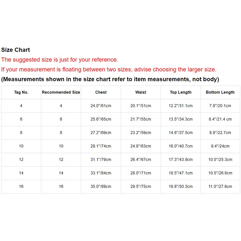 | Tag No. | Recommended Size | Chest | Waist | Top Length | Bottom Length |