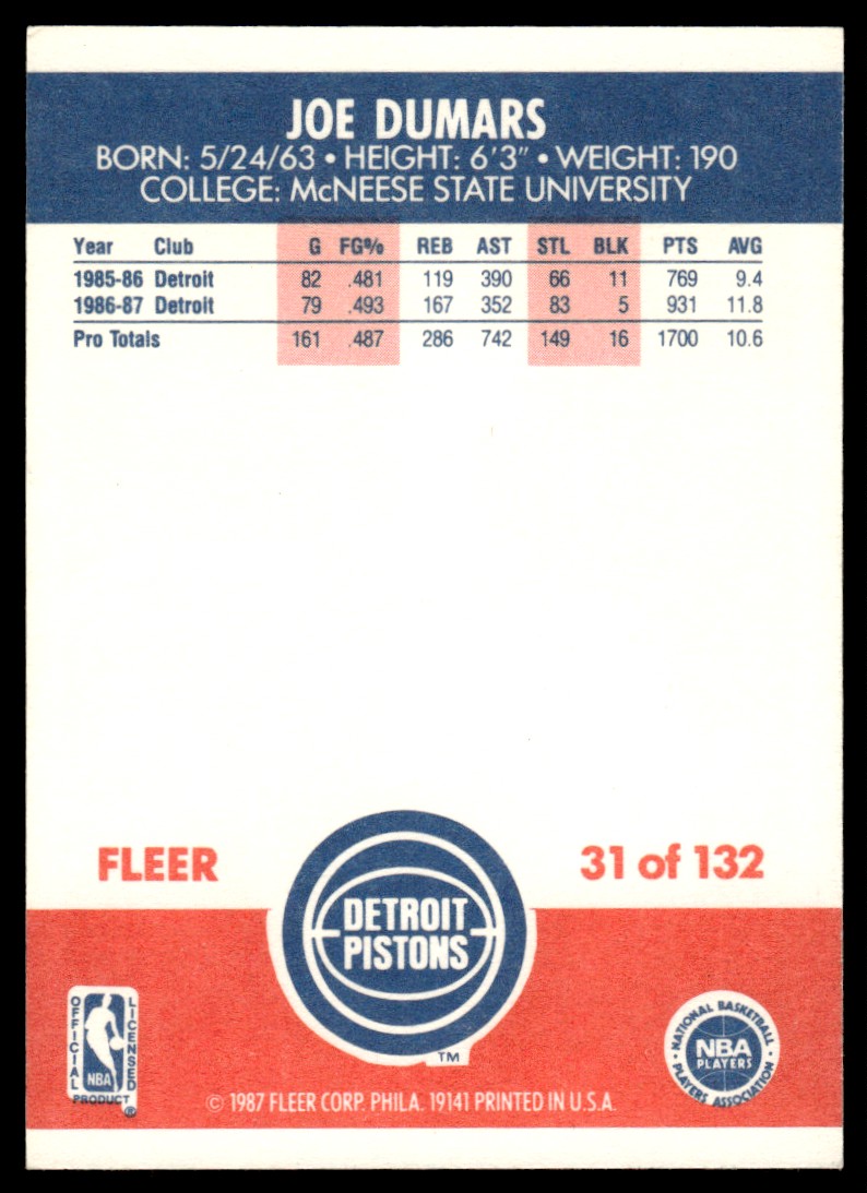 | 1987-88 Fleer Basketball Card Joe Dumars Detroit Pistons #31 EX-MT+ |