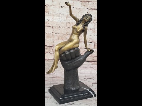 Experience the allure of a stunning bronze sculpture, capturing the essence of a naked lady in a seductive pose. Perched atop an oversized hand, this exceptional piece carries a subtle erotic undertone, adding a layer of intrigue to its beauty. The meticulous craftsmanship is evident in the lovely patination, with a rich brown hue for the hand creating a striking contrast against a gilt effect highlighting the lady.