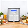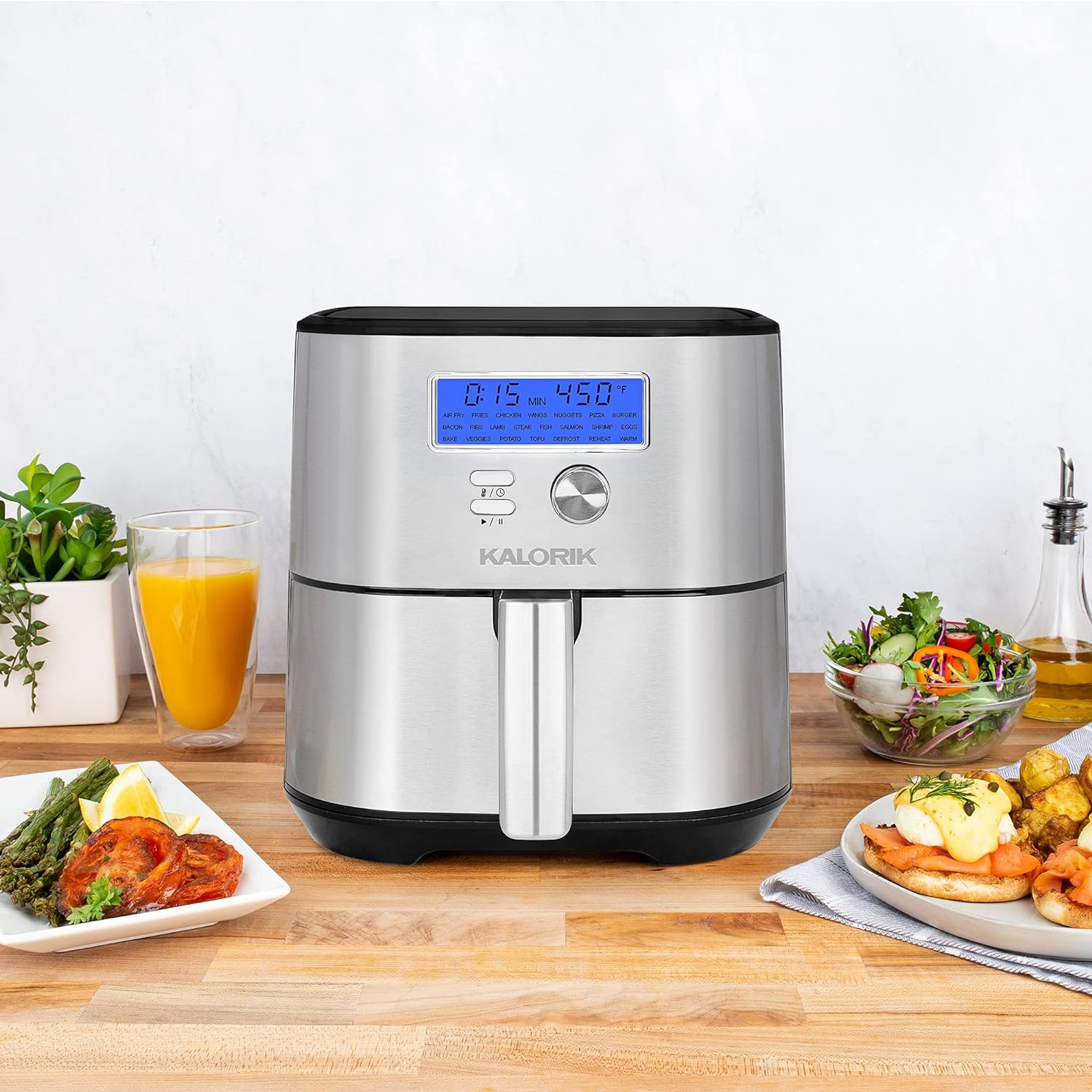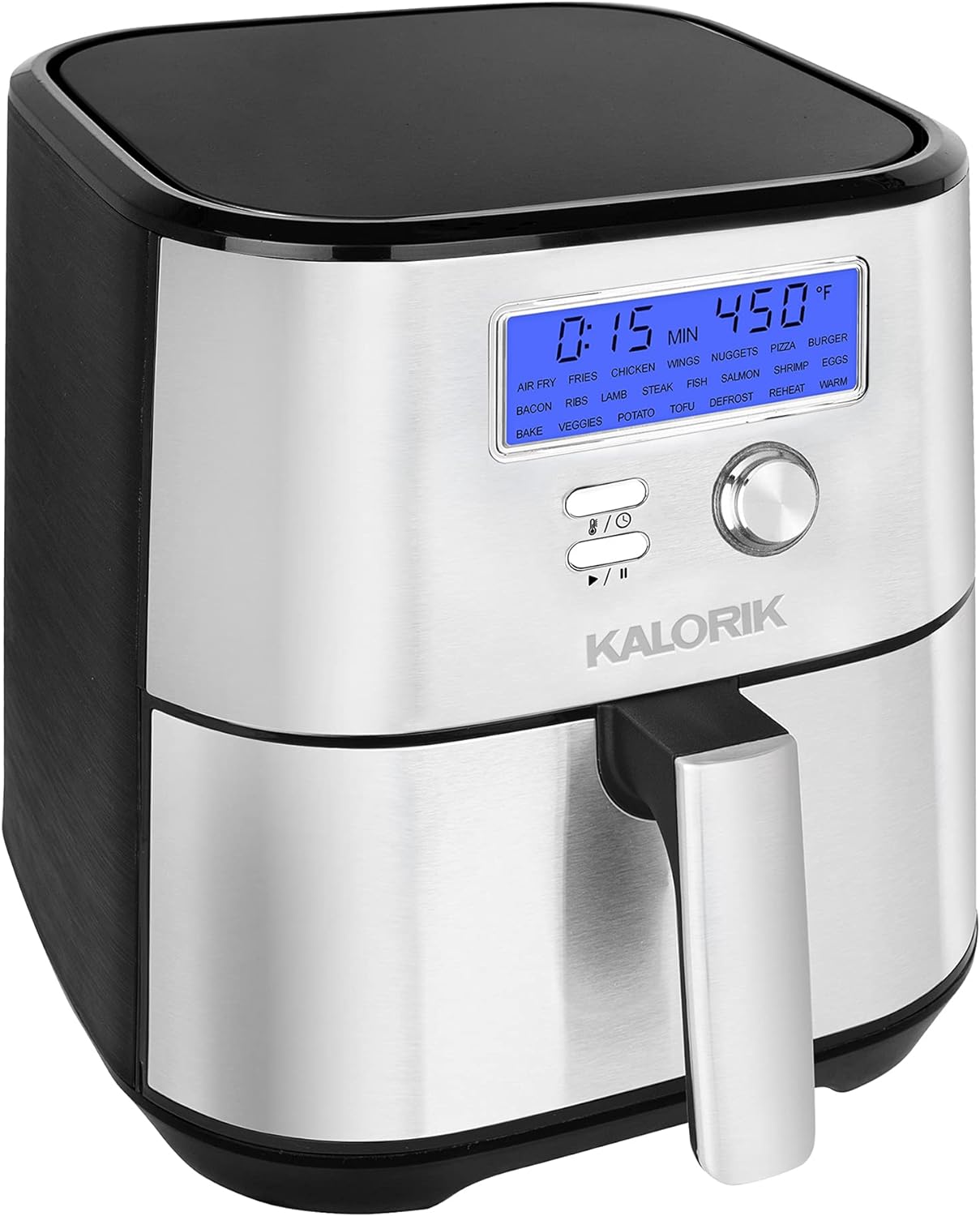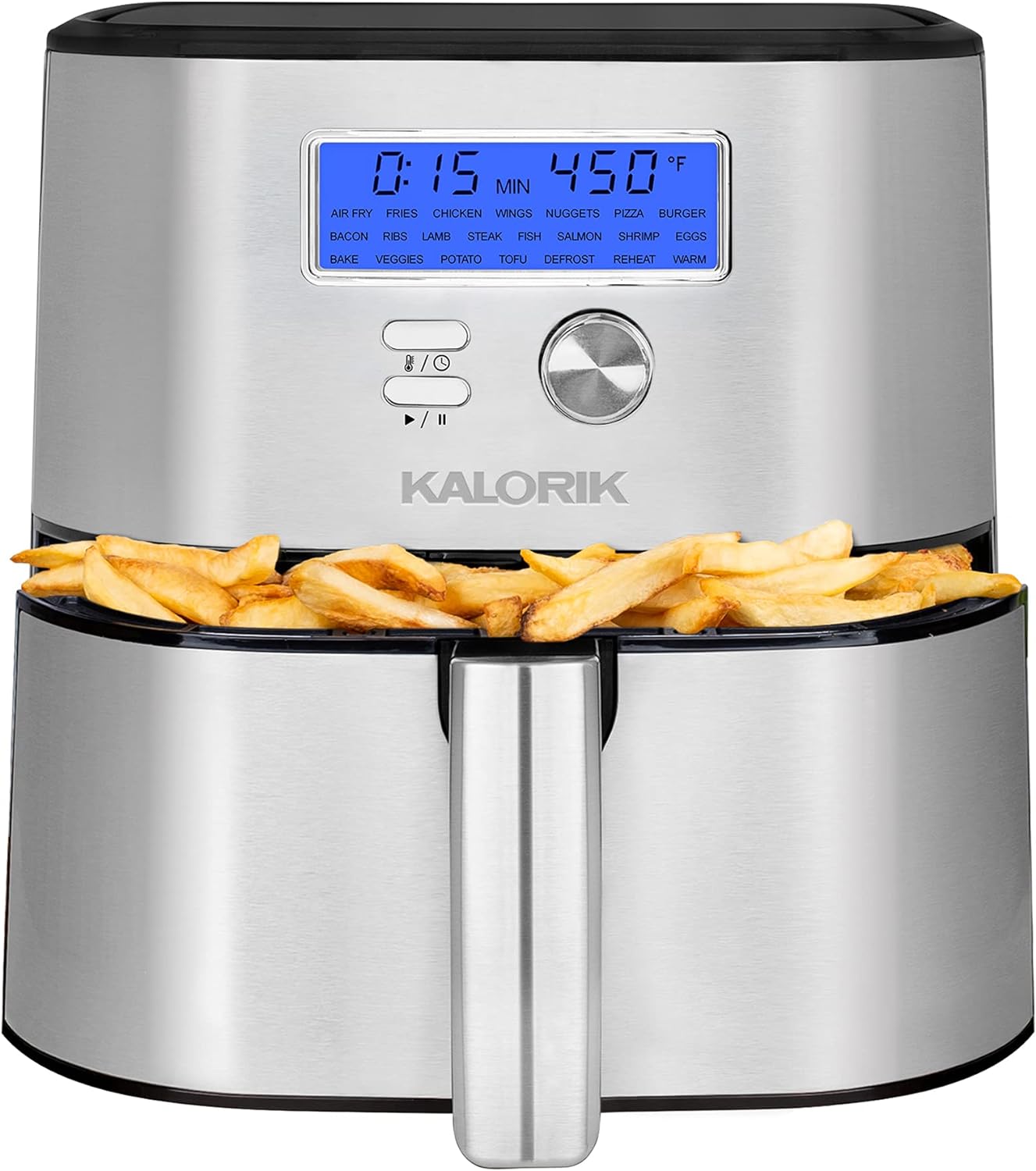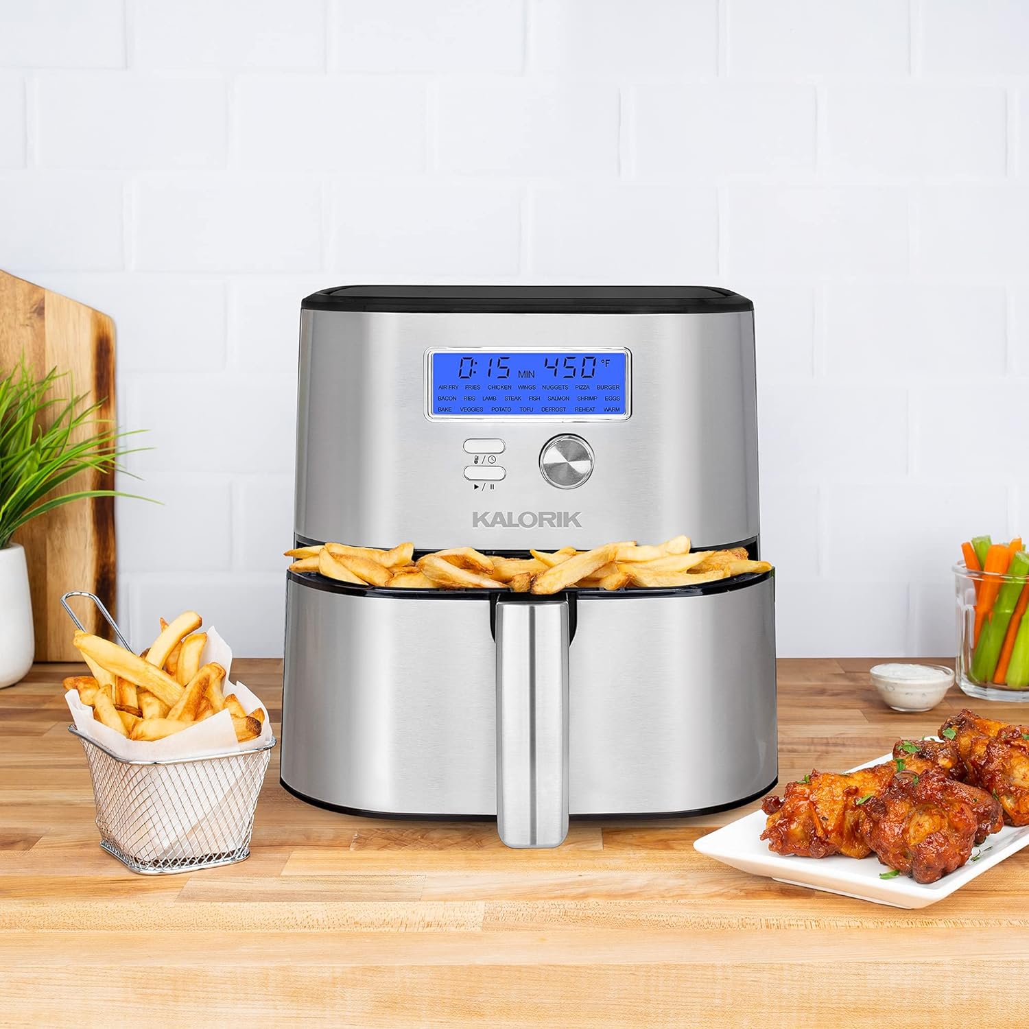Multifunctional air fryer lets you air fry, bake, roast, broil, poach, defrost, reheat, and warm meals at the touch of a button Turbo MAXX Technology and 1750 watts of power cook food in a fraction of the time — no preheating required Fries food to a perfect golden crisp with little to no oil needed, reducing fat and calories to make indulgent fried food healthy Intuitive LCD display with adjustable time (60 min) and temperature (120°F–450°F) and 22 smart presets to take the guesswork out of gourmet home cooking Bonus egg tray and Eggs preset poaches eggs to evenly-cooked perfection for foolproof breakfast and brunch Transforms soggy leftovers and restores their fresh taste and crunchy texture Makes delicious crispy french fries, onion rings, fried chicken, shrimp, mozzarella sticks, veggies, pizza, nuggets, bacon, burgers, tofu, and more Double nonstick-coated XL 7 quart basket and trivet is removable and dishwasher safe, for easy cleanup