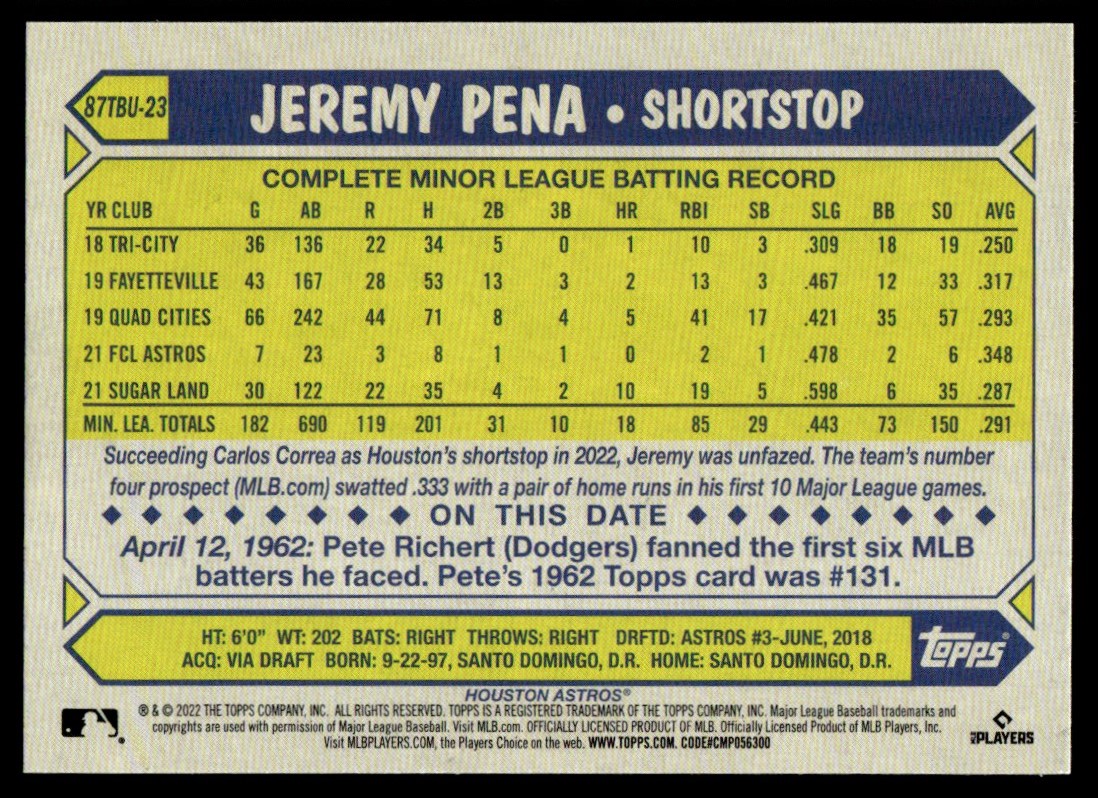 | 2022 Topps Update 1987 Throwback Jeremy Pena Rookie Houston Astros #87TBU-23 |