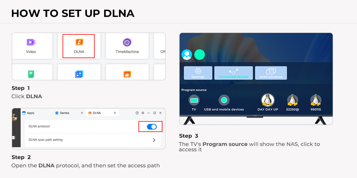 ćEstablishing a home cloud cinemaćThrough the DLNA protocol, you can sit with family and friends, view photo albums or watch movies on TV, and share happy moments.