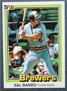 Up for bids is a 2 1/2" wide by 3 1/2" long 1981 Donruss baseball card # 84 that has been signed / autographed by Milwaukee Brewers star Sal Bando (Died in 2023)-The card features a great image of Bando with a vintage blue ink signature signed on front-Card shows only light wear and the signature is strong-A nice item with a 100% authentic signature. Pretty uncommon signer too! Postage on this item is $ 4.95.