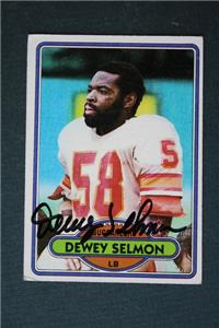Up for bids is a 2 1/2" wide by 3 1/2" long 1980 Topps football card # 498 that has been signed / autographed by Tampa Bay Buccaneers star Dewey Selmon-The card features a great image of Selmon with a large black ink signature signed on front-Card shows only light wear and the signature is strong -A nice item with a 100% authentic signature. Postage on this item is $ 4.95.