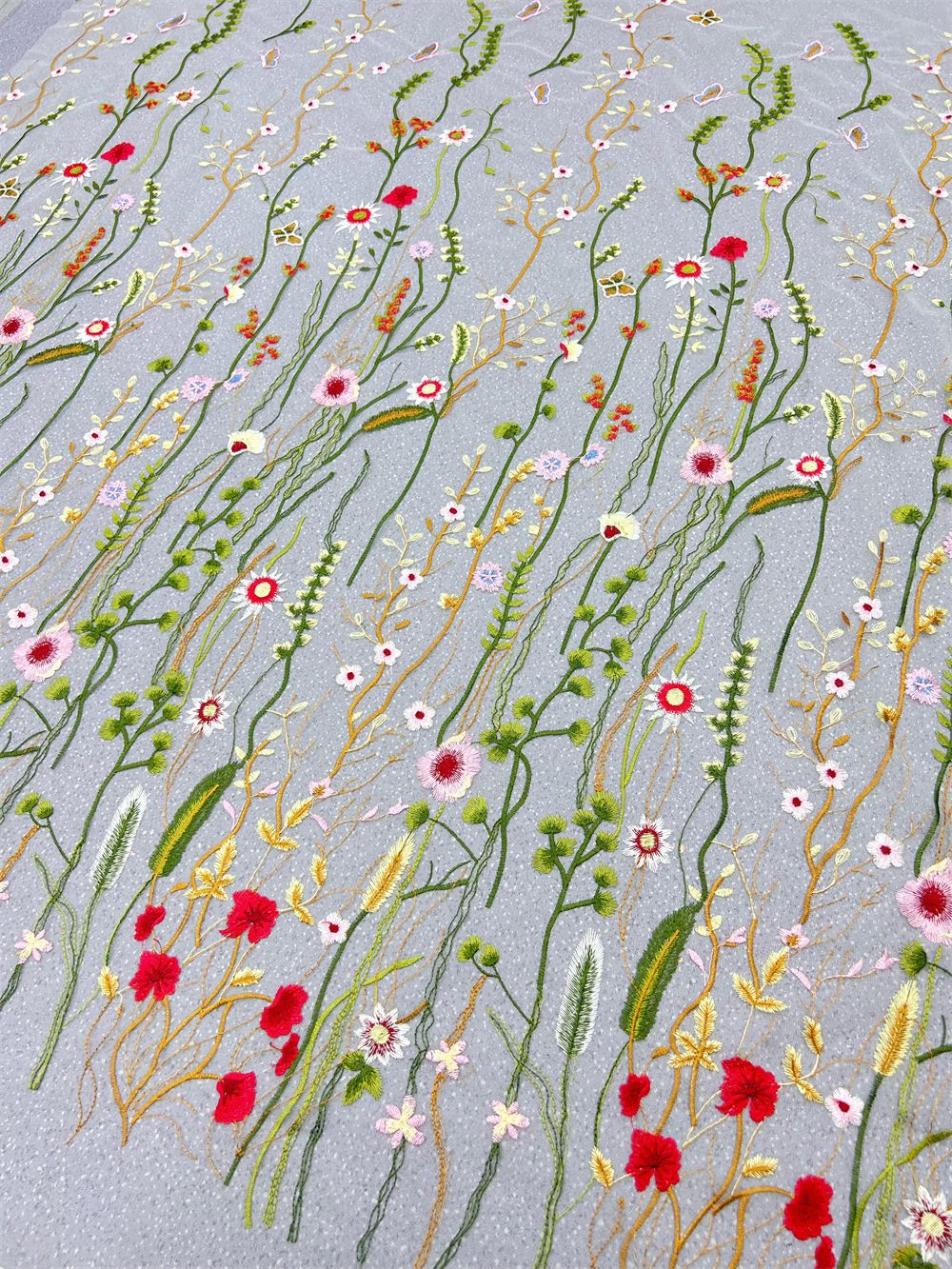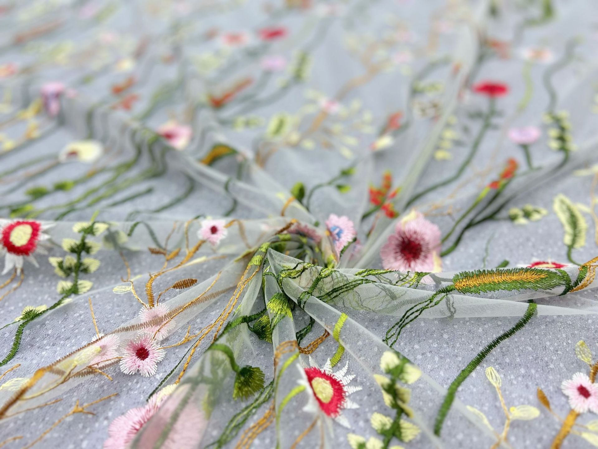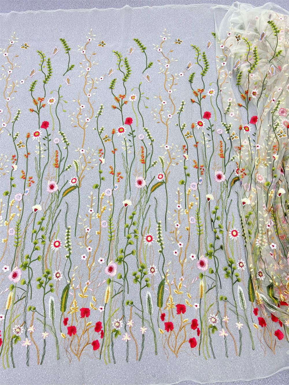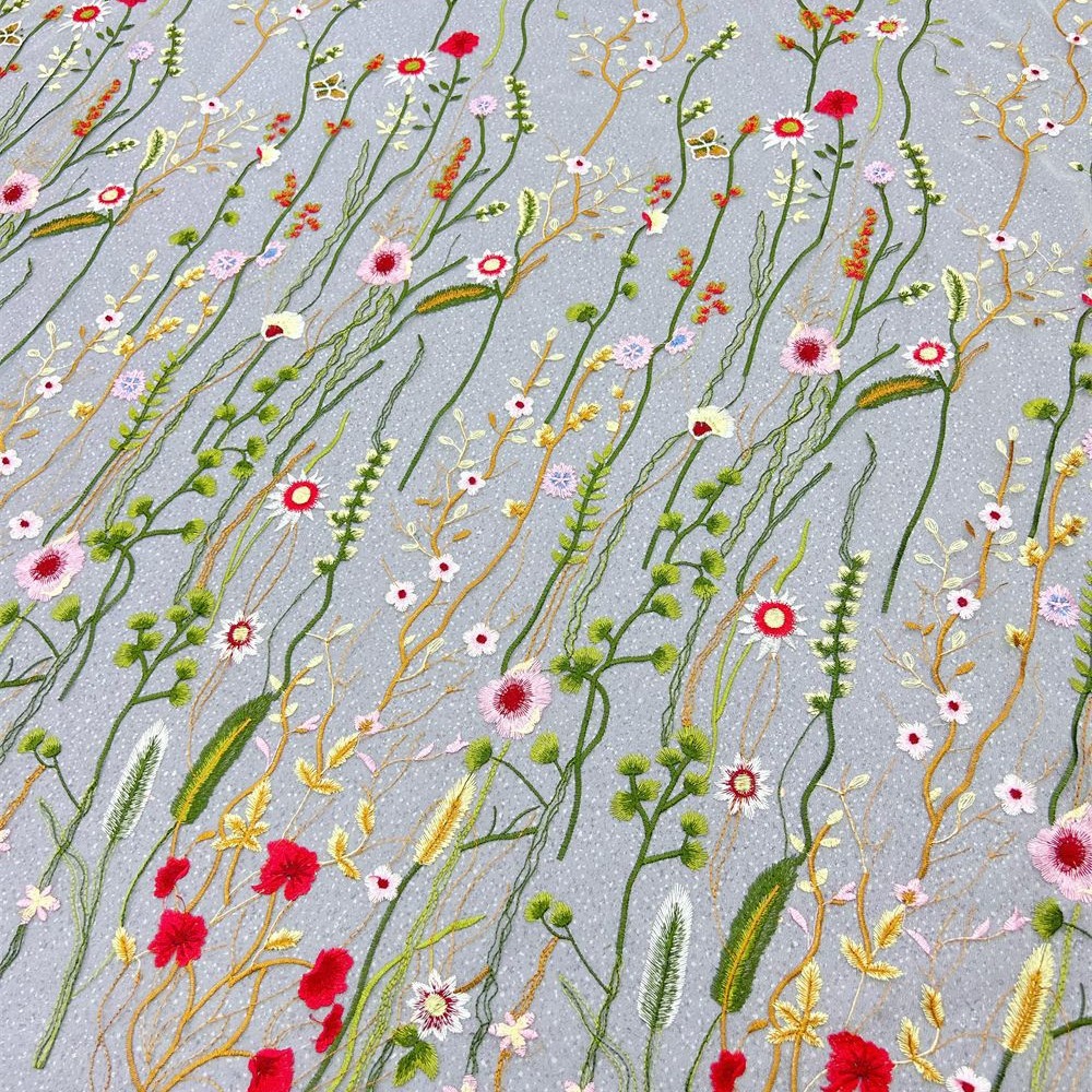 White tulle fabric, colorful floral embroidered lace fabric for wedding gown, bridal capes, cocktail dress