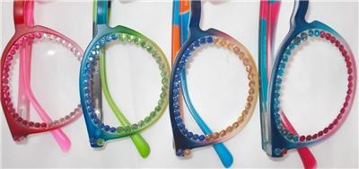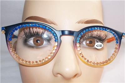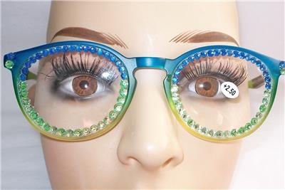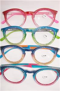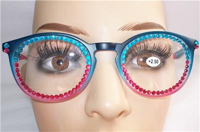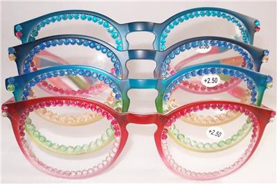 THE READING GLASS FRAMES ARE 2 TONE COLORS AS ARE THE RHINESTONES ACROSS THE LENS.