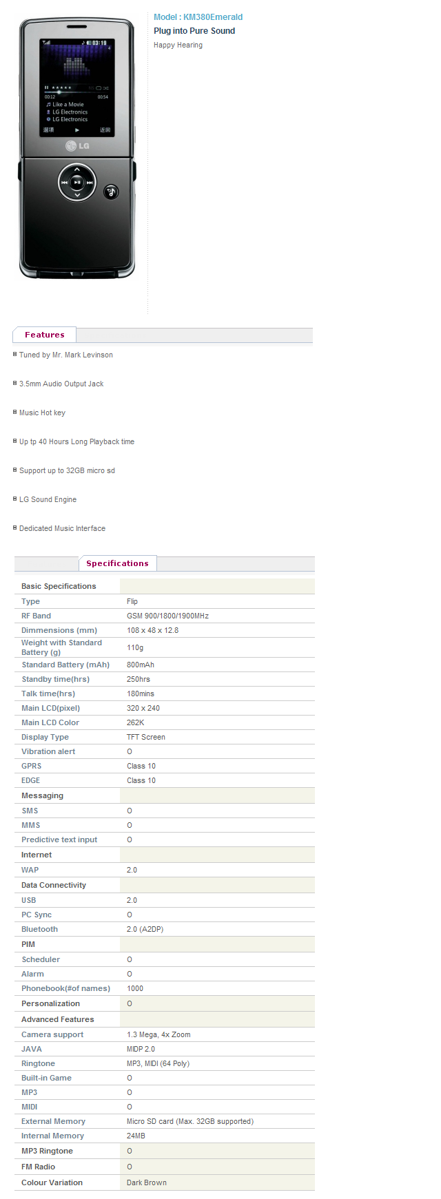 | LG KM380 1.3MP 2" FM MP3 A2DP Mark Levinson Music Keyboard Flip GSM Cell Phone Brand: LG Model: KM380 (KM380T) Condition: New in Box Color(s): Dark Brown + Orange Point ---------------------------------------------------------------------------------------------------------------------- Please note that this phone is now available in the following Firmware(s) from LG. Therefore, please let us know your preferred Firmware(s) after purchase. Available Firmware(s) from LG : 1) Western European Firmware: comes with the following languages - English, Bulgarian (български), Croatian (Hrvatski), Czech (Čeština), Danish (Dansk), Dutch (Nederlands), Finnish (Suomi), French (Français), German (Deutsch), Greek (Ελληνικά), Hungarian (Magyar), Italian (Italiano), Norwegian (Norsk), Portuguese (Português), Romanian (Română), Serbian (српски) (srpski jezik), Slovak (Slovenčina), Slovene (Slovenščina), Spanish (Español), Swedish (Svenska), Turkish (Türkçe) 2) Asia-Pacific Firmware: comes with the following languages - English, Simplified Chinese (简体中文), Traditional Chinese (繁體中文), Thai (ภาษาไทย), Indonesian (Bahasa Indonesia), Vietnamese (Tiếng Việt) 3) Russian Firmware: comes with the following languages - English, Estonian (eesti keel), Kazakh (қазақ тілі, qazaq tili, قازاق تىلى), Latvian (latviešu valoda), Lithuanian (lietuvių kalba), Russian (Русский), Ukrainian (Українська) 4) Arabic Firmware: comes with the following languages - English, Arabic (العربية ), Persian (فارسی), French (Français), Russian (Русский) ---------------------------------------------------------------------------------------------------------------------- SIM: Mini-SIM (not Micro-SIM or Nano-SIM) Simlock: Factory Unlocked to accept any SIM Network: GSM (2G) 900/1800/1900 Compatibility: Please make sure to check if your Cellular Carrier provides the above supported Network Frequency Bands of this phone before purchase as we do not accept any return for network incompatibility issues. Contents: Android Smartphone, Removable Battery (800mAh), Power Adapter, USB Cable, Stereo Earphones, Software Disc, English Manual |