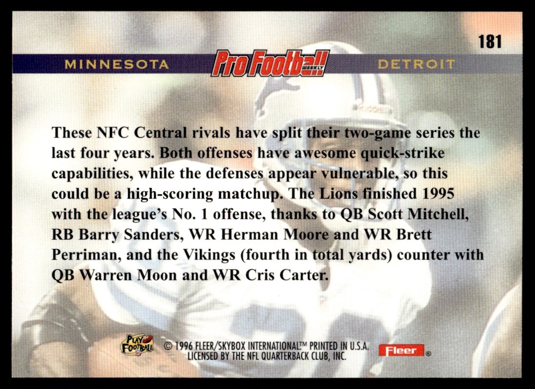 | 1996 Fleer Football Card Barry Sanders Detroit Lions #181 |