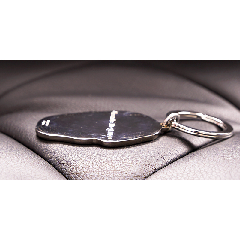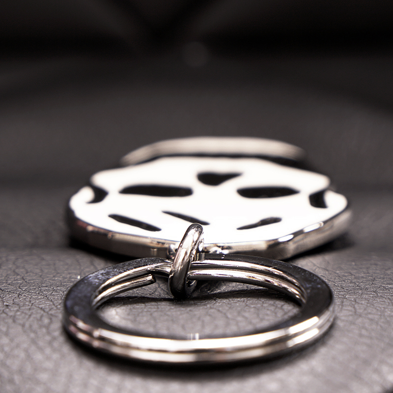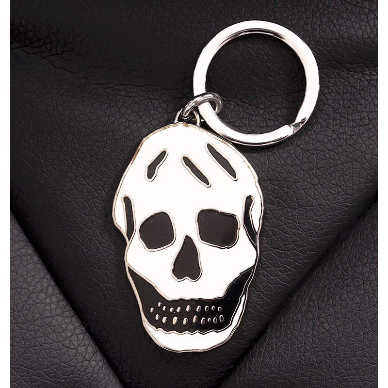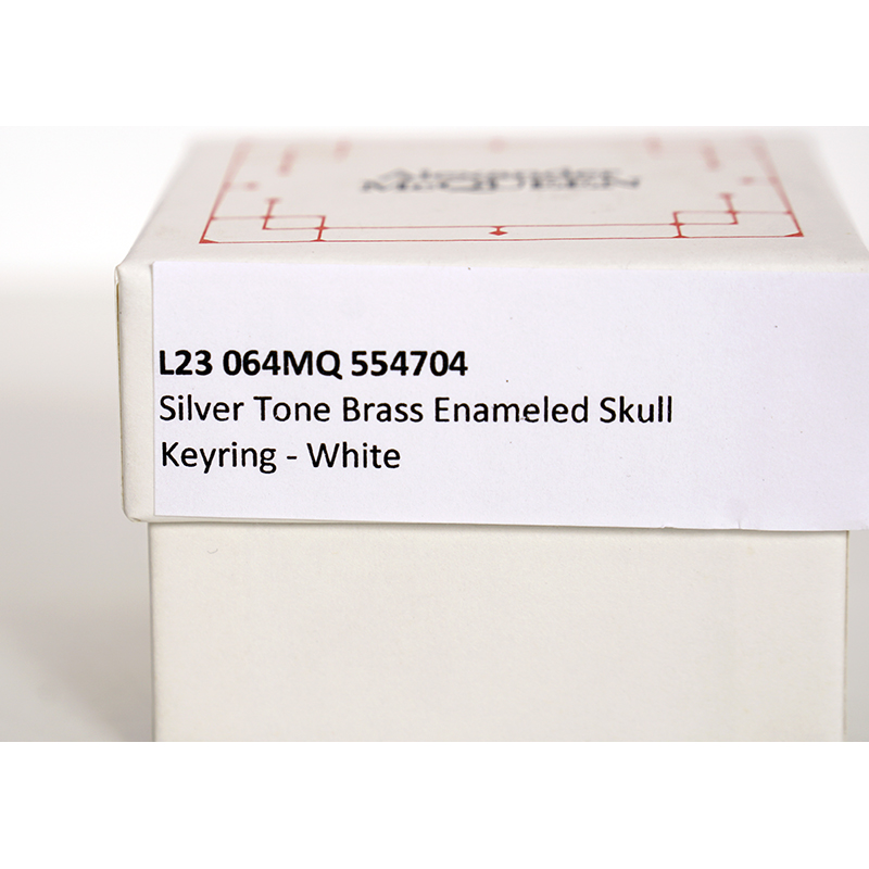 Authentic Alexander McQueen keyring in a distinctive style. This keyring features a white enamel grinning logo skull charm with black accents. The back of the charm is silver tone with the Alexander McQueen hallmark logo. The hardware is crafted from brass. Style 554704. Made in China. A great accessory to add a touch of rock-and-roll flair to any bag or set of keys.