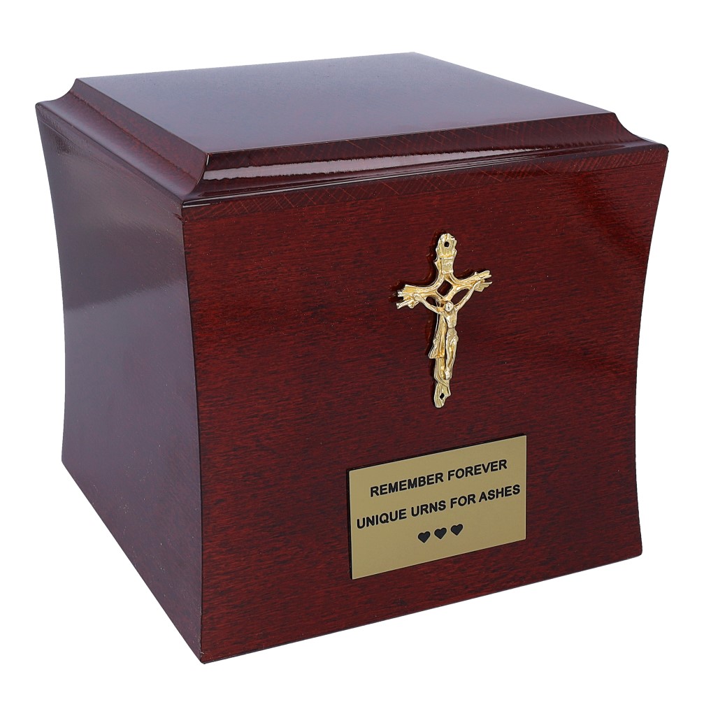 This urn seamlessly blends modern aesthetics with enduring religious symbolism. The clean lines and elegant mahogany wood create a sophisticated look, while the gold cross offers a timeless symbol of faith. This combination ensures the urn serves as a beautiful and respectful memorial in any setting.
