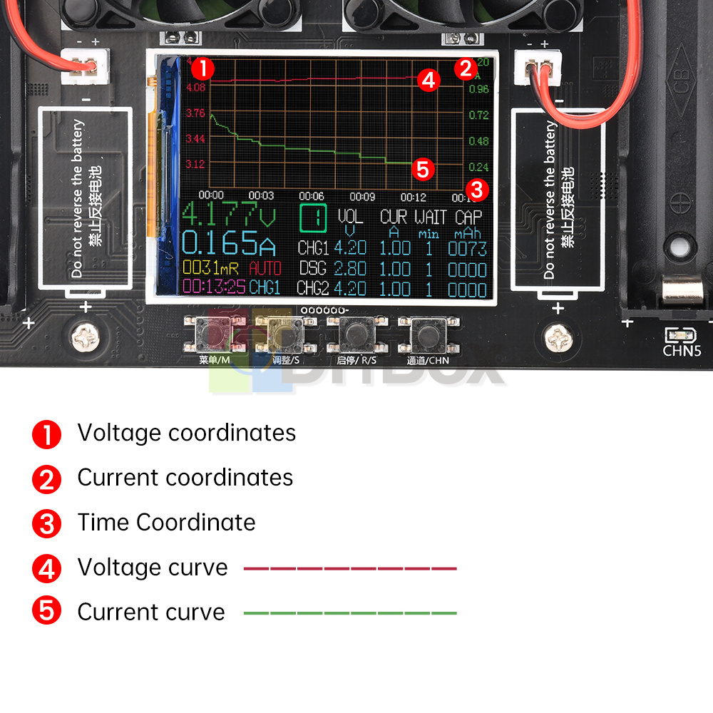 External test: support, can be discharged through the 2P terminal external, a single channel single time only and can only support the battery holder or external test in one, can not be used at the same time the battery holder and external battery test.