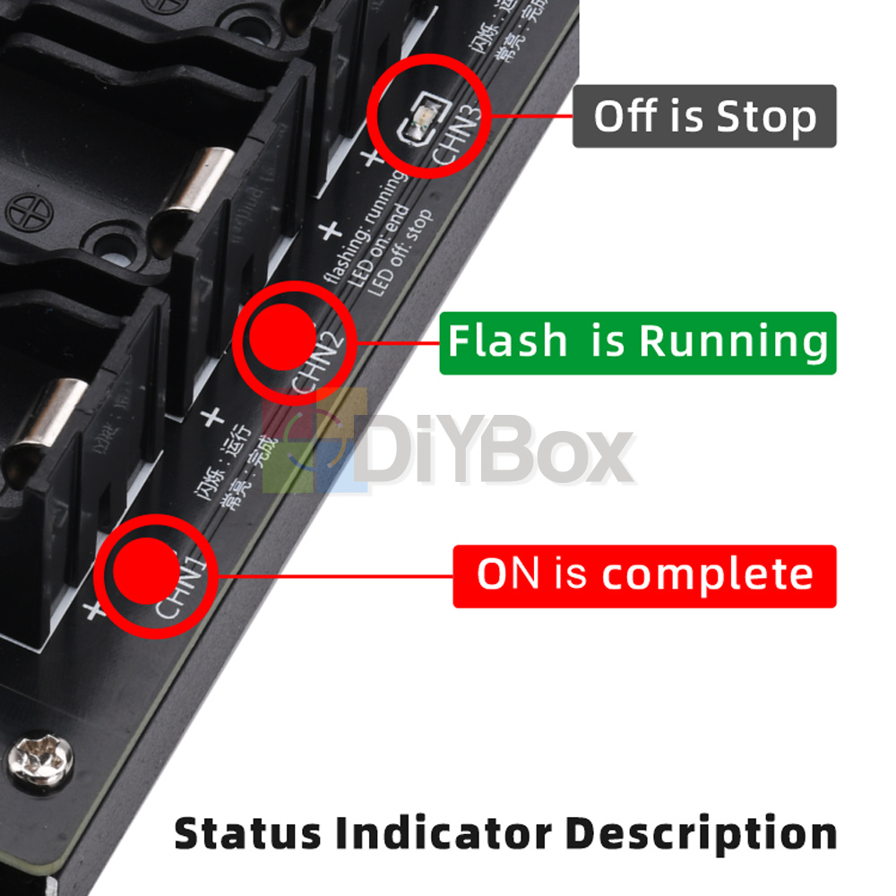 1. The blue segment at the upper end is the external discharge terminal, and the lower end has the working indicator of the corresponding channel.