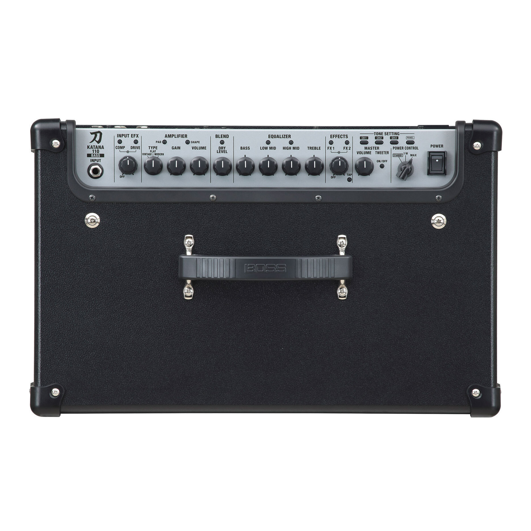 The Katana-110 Bass brings you high-performance amplification fueled by decades of BOSS knowledge and expertise. Armed with 110 watts of time-tested class AB power, this gig-ready amp provides big volume, punch, and presence and smooth, natural drive as you turn up the gain. Three unique preamp types are also available—each with a powerful three-way Shape switch to fine-tune the character—so you’ll always have the perfect sound for any style or genre. Vintage type is a classic tube voice with organic tone and natural drive. Flat is a smooth, clear, and dynamic tone with rich harmonic character. Modern offers a quick dynamic response with extended bass range.