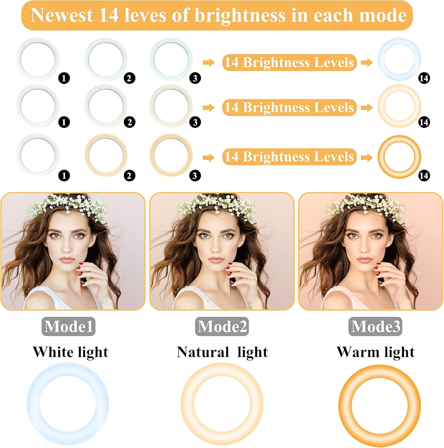 【Ring light with 3 Light Modes & 14 Brightness】-- 12 inch dimmable led selfie ring light with 3 lighting modes: warm, natural and cold,.Each lighting mode has 5 adjustable brightness to choose. You can adjust the modes and brightness to meet your needs for lighting under different occasions