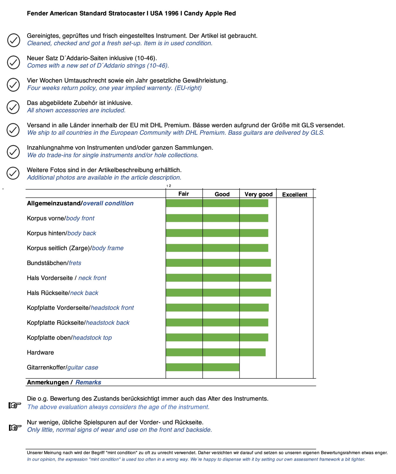 Sie kaufen exakt die auf den zahlreichen Bildern abgebildete gebrauchte Gitarre mit dem ebenso gezeigten Zubehör. Die altersbedingten Gebrauchsspuren gehen hieraus i.d.R. gut hervor. Eine kurze Zustandsbeschreibung finden Sie auf dem ersten Foto dieser Anzeige.