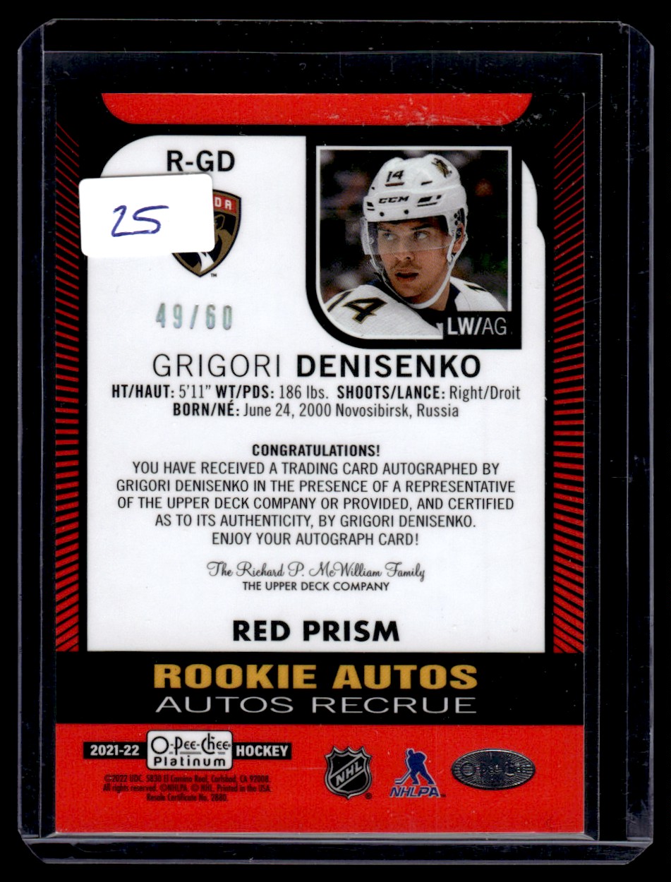 | 2021-22 O-Pee-Chee Platinum Rookie Red Prism Grigori Denisenko RC Auto /60 |