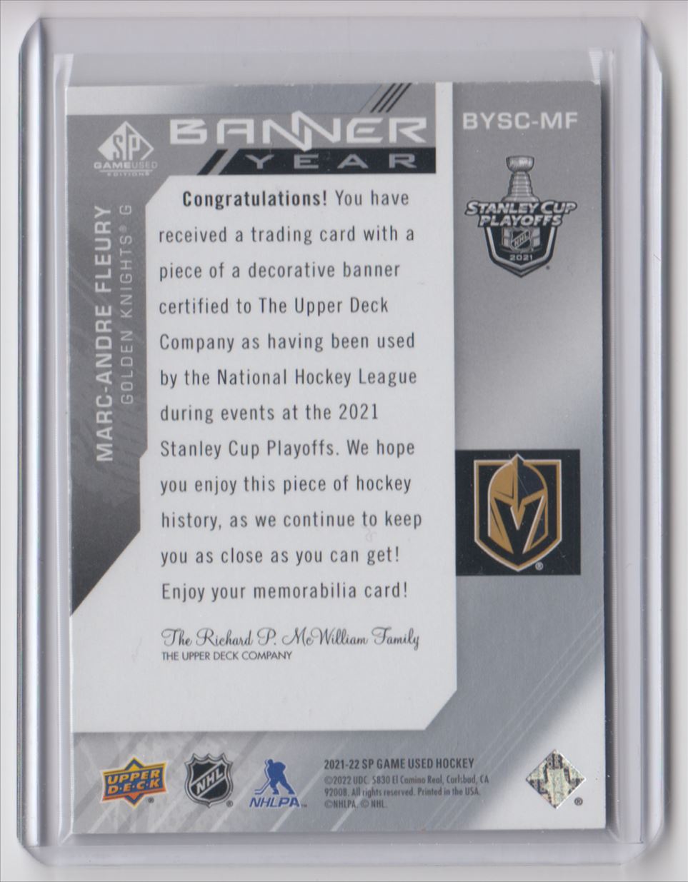 | 2021-22 SP Game Used Banner Year Dual Jersey Marc-Andre Fleury Vegas Golden |