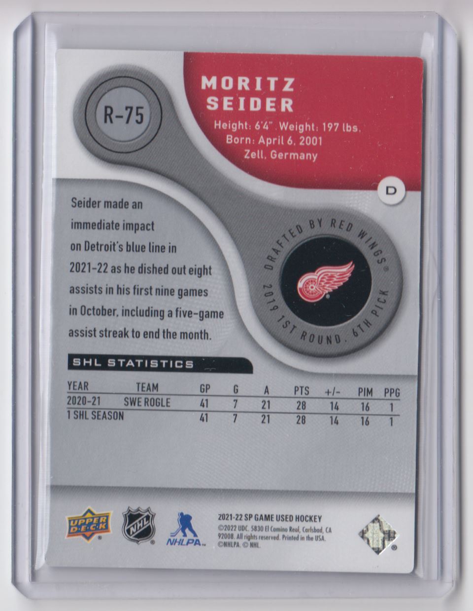 | 2021-22 SP Game Used 2005-06 Retro Rookies Moritz Seider /999 Detroit Red Wings |