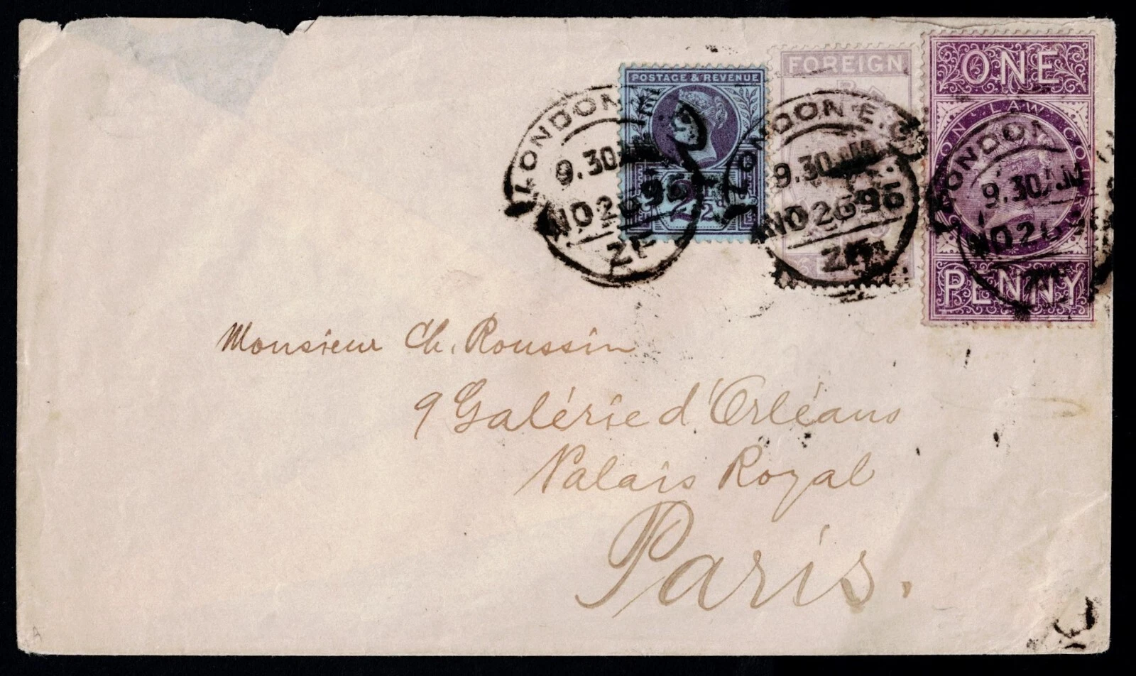 A fine used 3d Lilac Fiscal Foreign Bill and 1d Lilac Law Court on envelope cancelled London Hooded circle for 26 November 1896, together with 2 1/2d Jubilee used to the Galerie d'Orleans at the Palais Royal, Paris. Scarce and very attractive usage. Trivial cover faults.