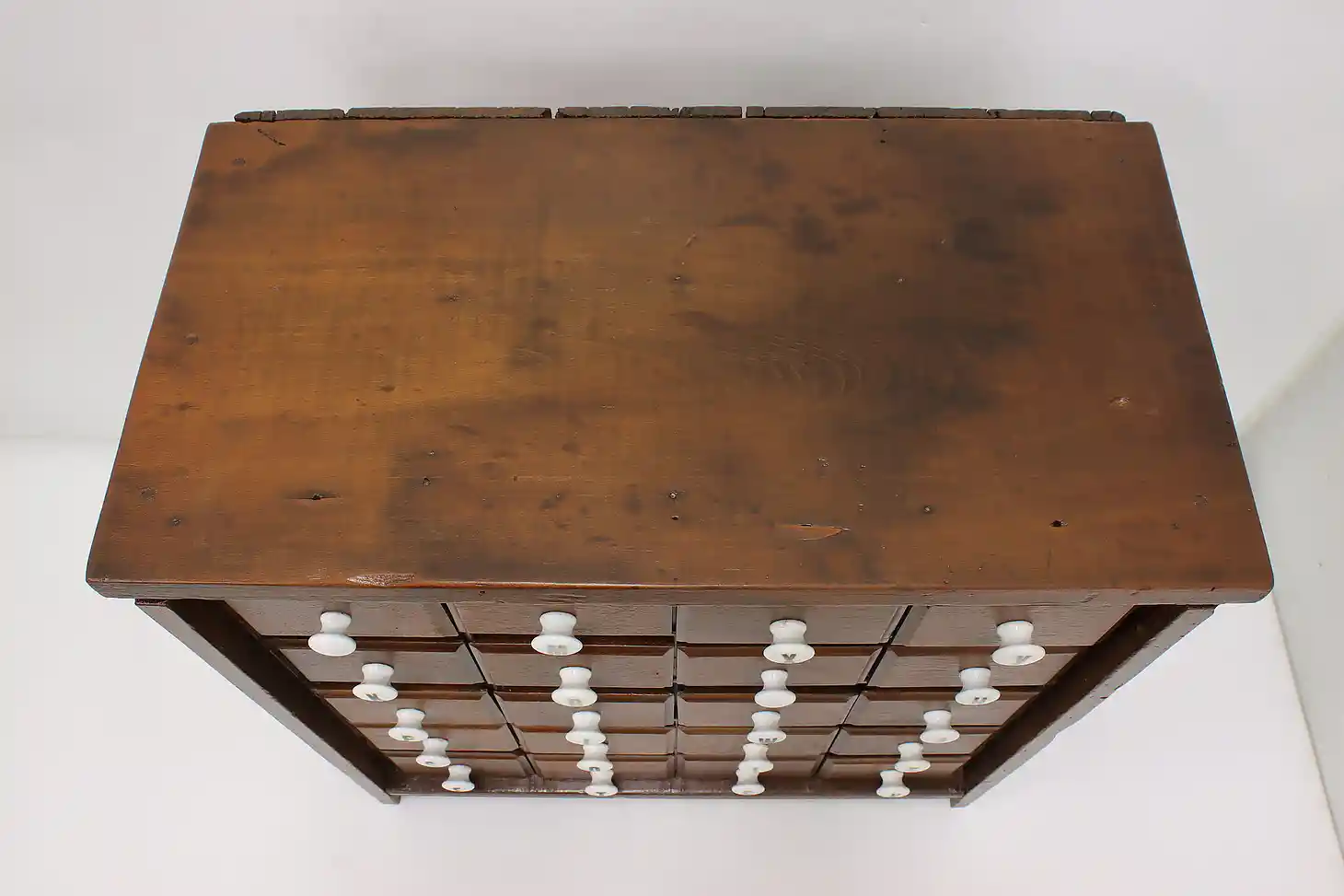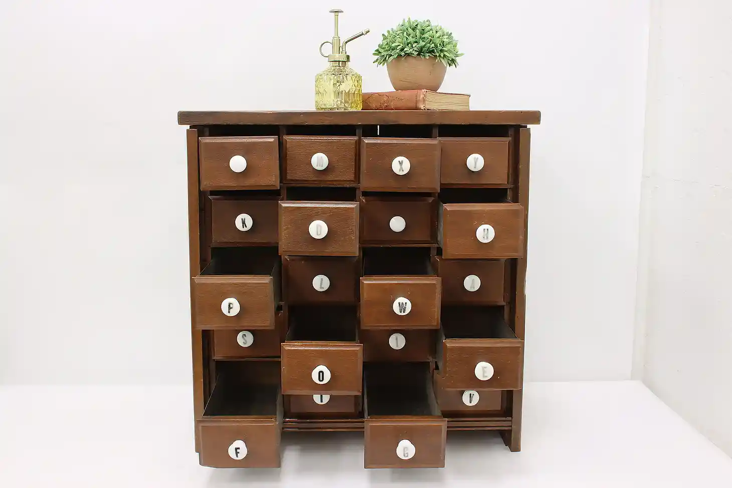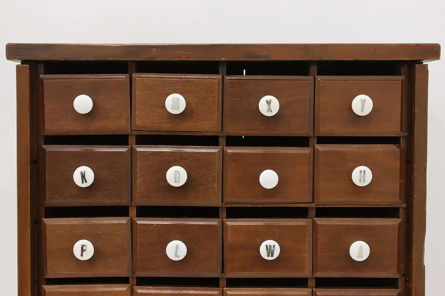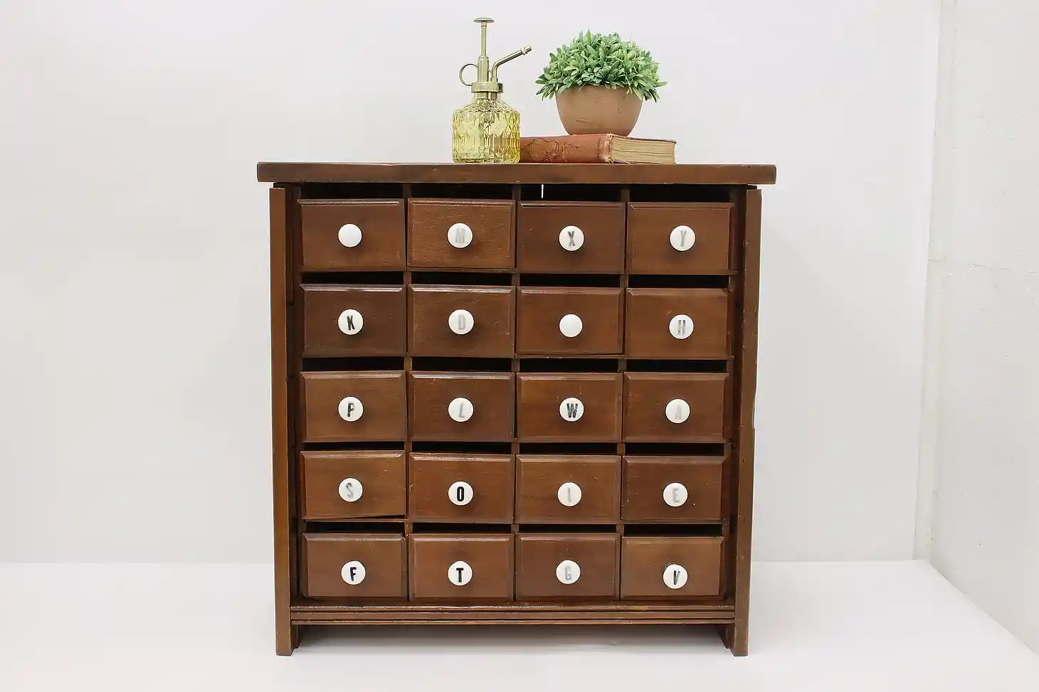 This farmhouse twenty drawer apothecary or spice cabinet has porcelain knobs with painted letters.