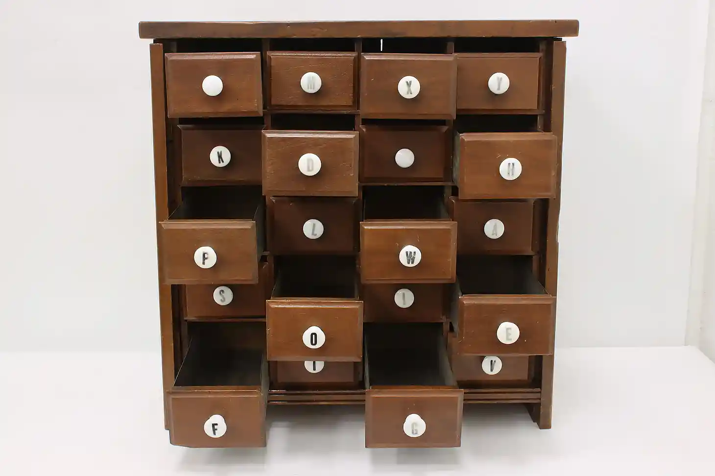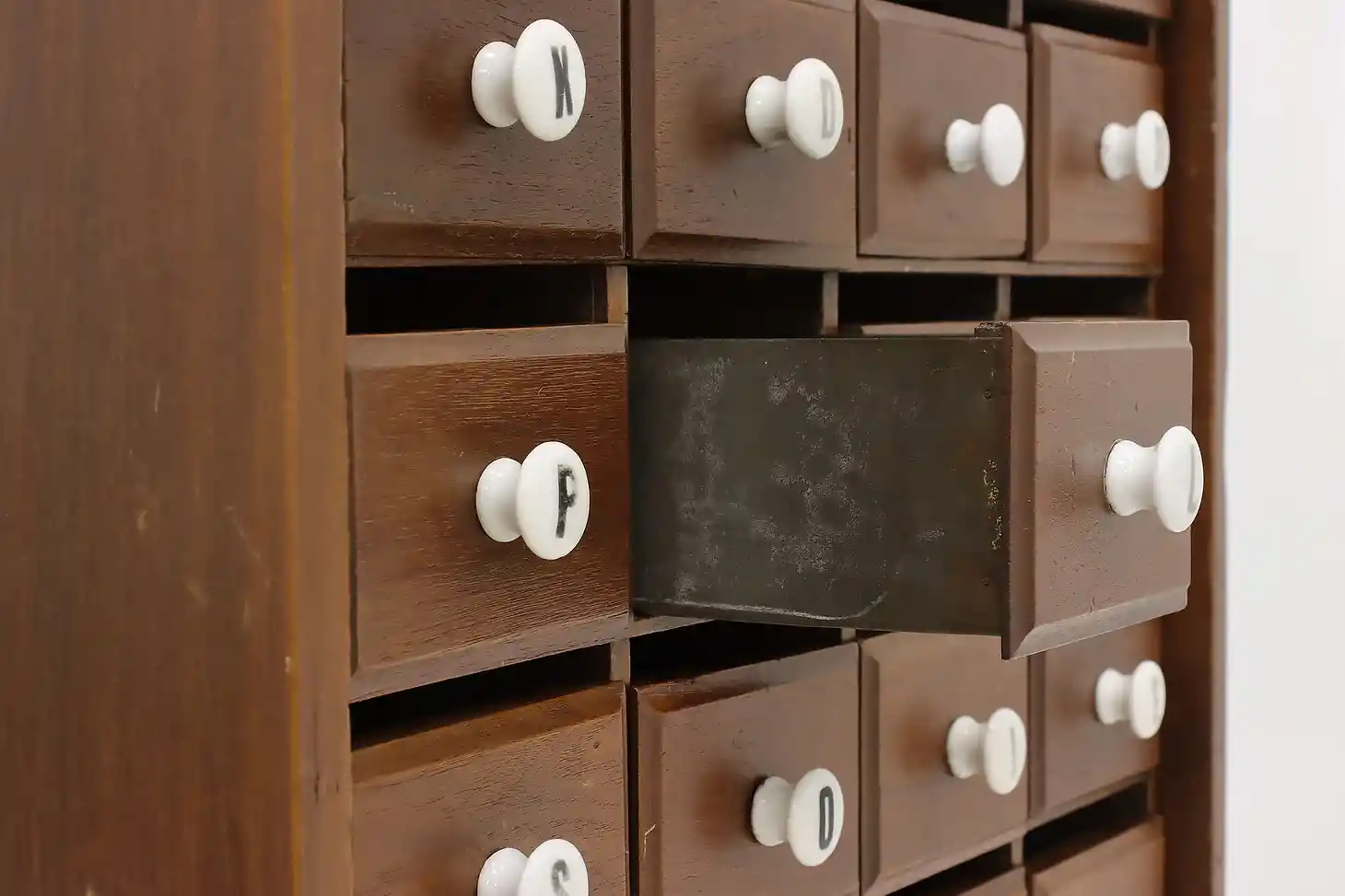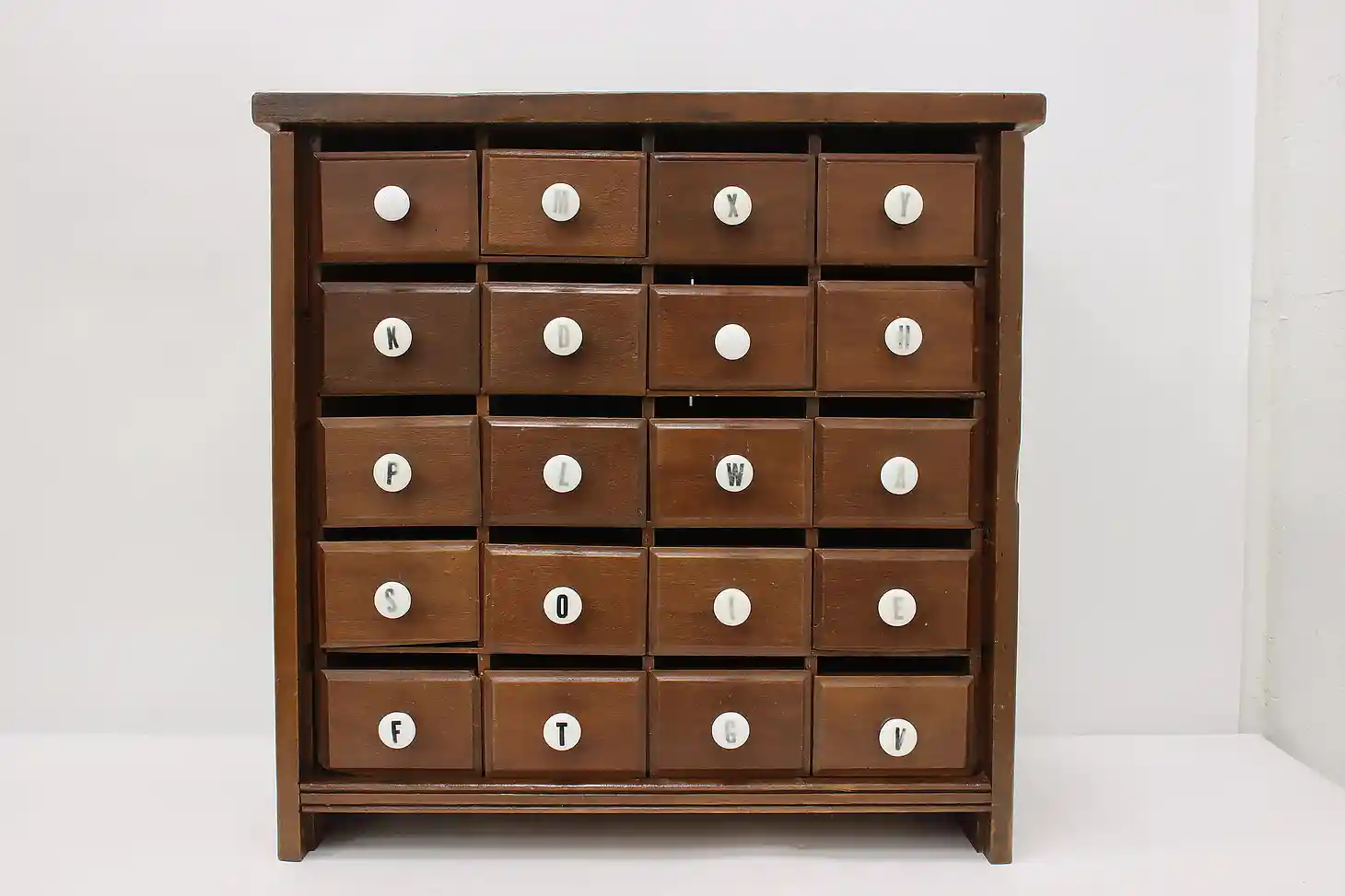 This farmhouse twenty drawer apothecary or spice cabinet has porcelain knobs with painted letters.