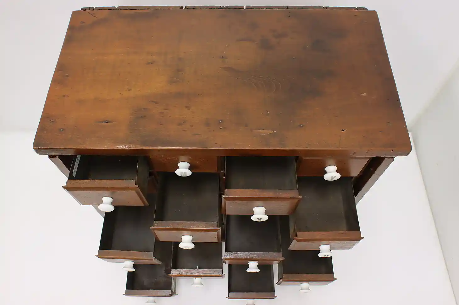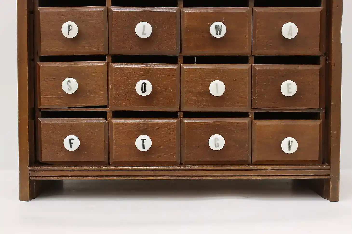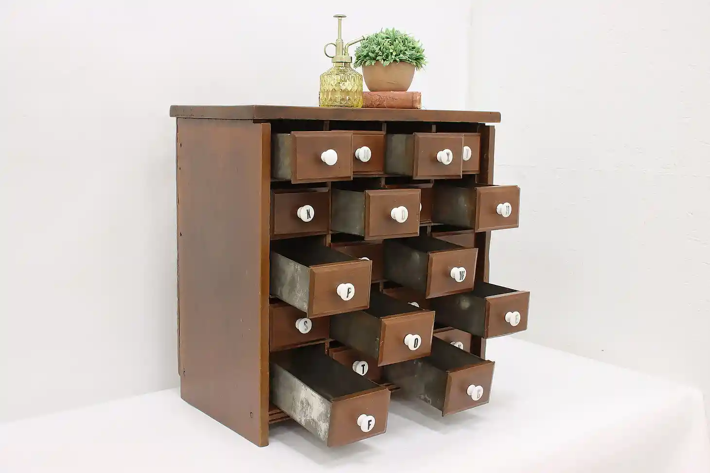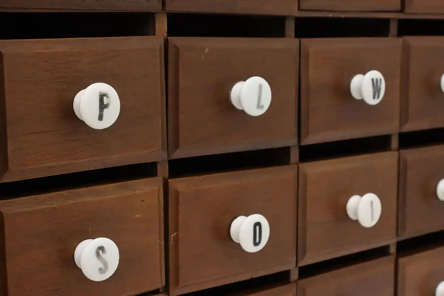 This farmhouse twenty drawer apothecary or spice cabinet has porcelain knobs with painted letters.