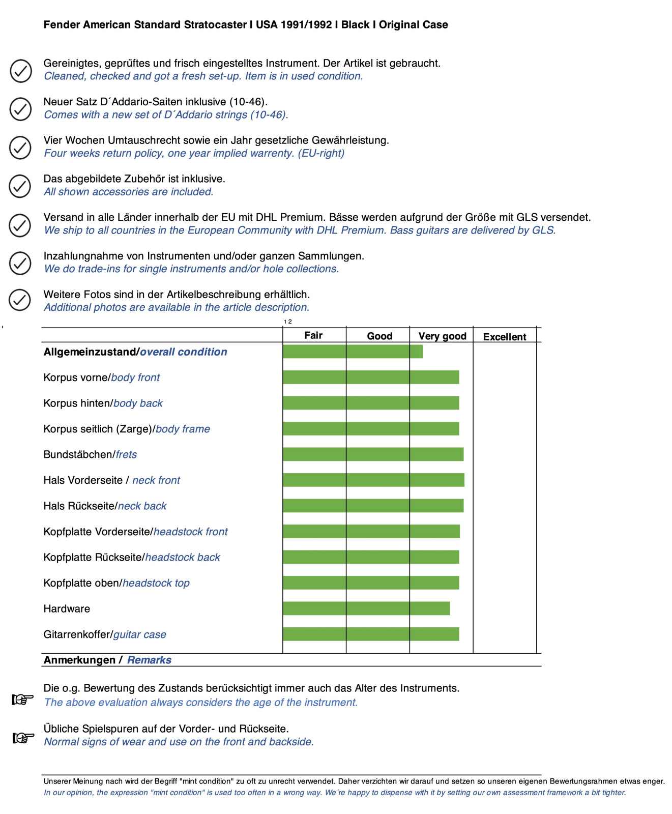Sie kaufen exakt die auf den zahlreichen Bildern abgebildete gebrauchte Gitarre mit dem ebenso gezeigten Zubehör. Die altersbedingten Gebrauchsspuren gehen hieraus i.d.R. gut hervor. Eine kurze Zustandsbeschreibung finden Sie auf dem ersten Foto dieser Anzeige.