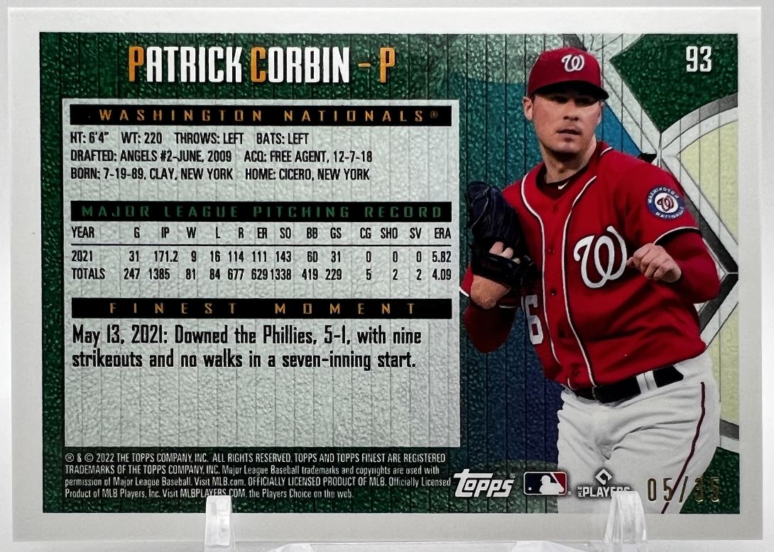 | 2022 Topps Finest Flashbacks Prism Refractor Patrick Corbin #93 05/35 Washington |