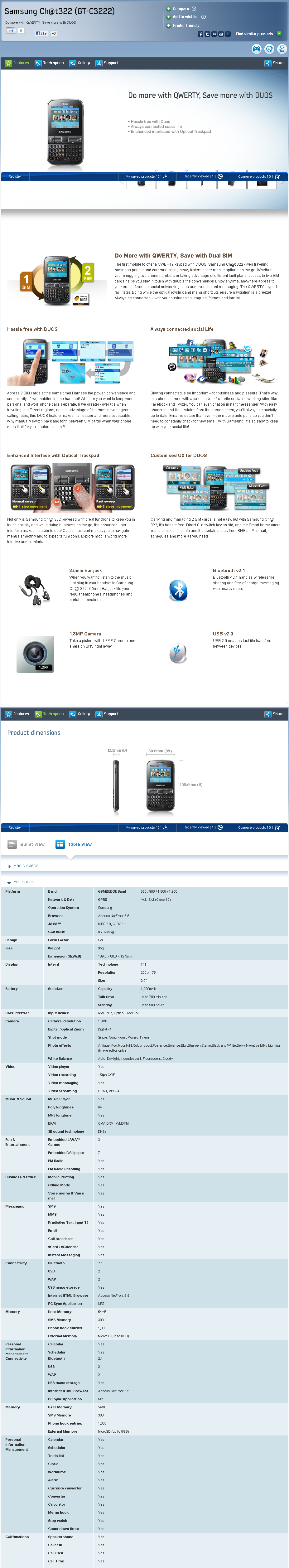 | Samsung Anycall GT-C3222 White Ch@t Chat 322 DUOS QWERTY Dual SIM 2G Cell Phone Brand: Samsung Model: Anycall GT-C3222 (Ch@t 322) Condition: New in Box Color(s): Pure White Language(s): English, Chinese SIM: SIM 1 & SIM 2 - Mini-SIM (not Micro-SIM or Nano-SIM) Simlock: Factory Unlocked to accept any SIM Network: SIM 1 & SIM 2 - GSM (2G) 850/900/1800/1900 Compatibility: Please make sure to check if your Cellular Carrier provides the above supported Network Frequency Bands of this phone before purchase as we do not accept any return for network incompatibility issues. Note(s): The English User Manual (PDF) of this phone by Samsung is available upon request. Contents: Cell Phone, Removable Battery (1000mAh), Power Adapter, USB Cable, Chinese Documentation |