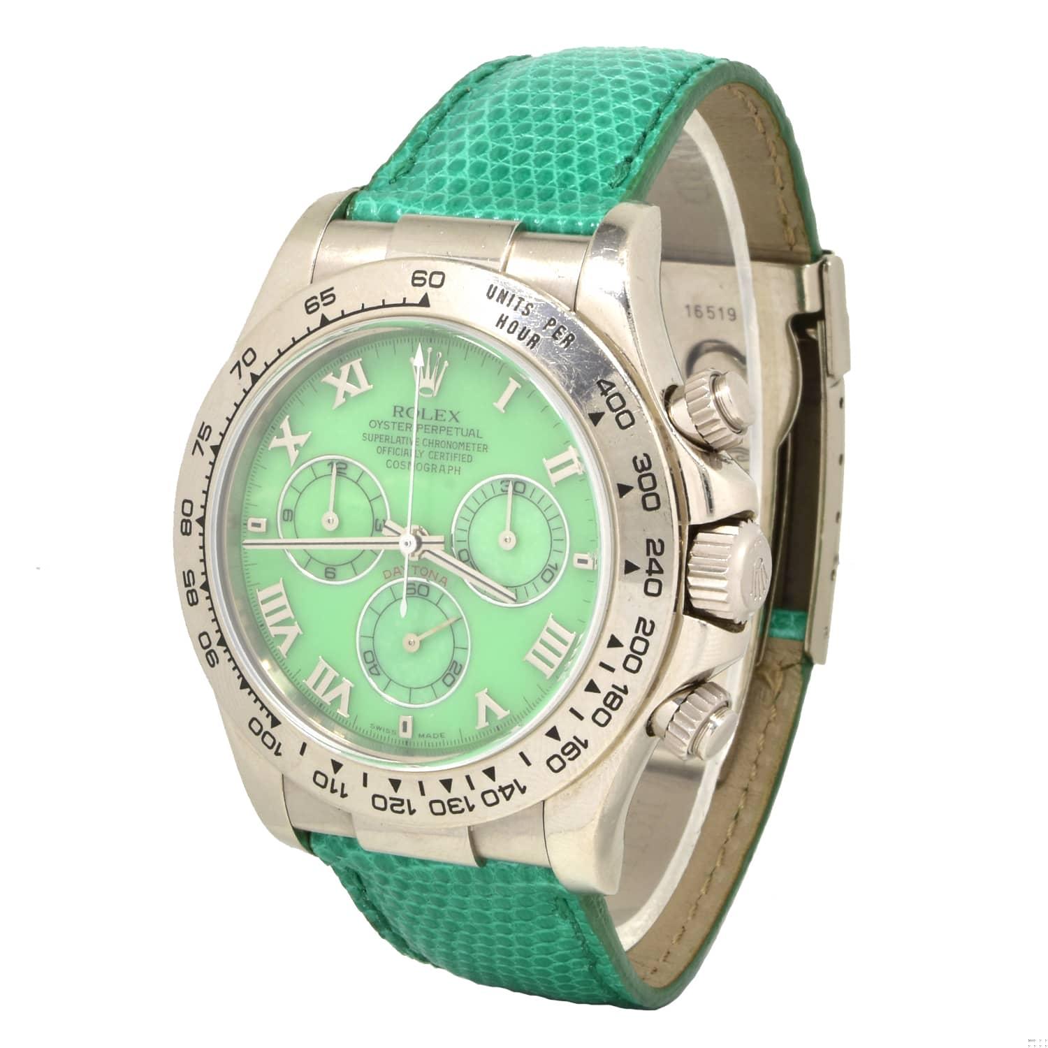This stunning and rare iteration of the Rolex Daytona Beach features a unique green chalcedony dial and is highly sought after by fans and collectors. A must-have for those looking for the perfect addition to their collection.