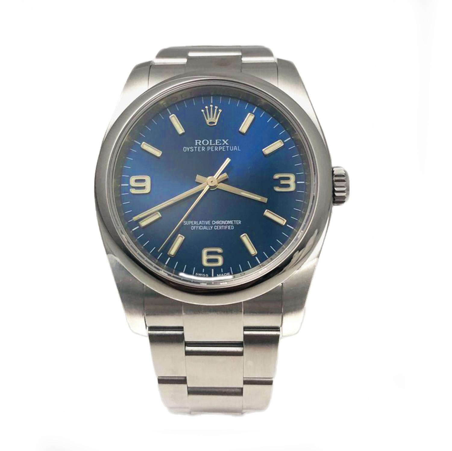 The Rolex reference 116000 is somewhat of an unknown treasure within the Rolex catalogs. It combines the daily practicality of Rolex Oyster Steel, a calibre 3230 self-winding movement, and a classic blue explorer-style 3, 6, 9 dial with luminous hour markers. This watch is a full set and is found in excellent condition. Made entirely of stainless steel with a beautiful smooth bezel, it has a clean look. The Rolex Oyster Perpetual is 34mm in size and can be paired with everyday outfits. If you're looking for a classic, elegant look, this is the timepiece to get.